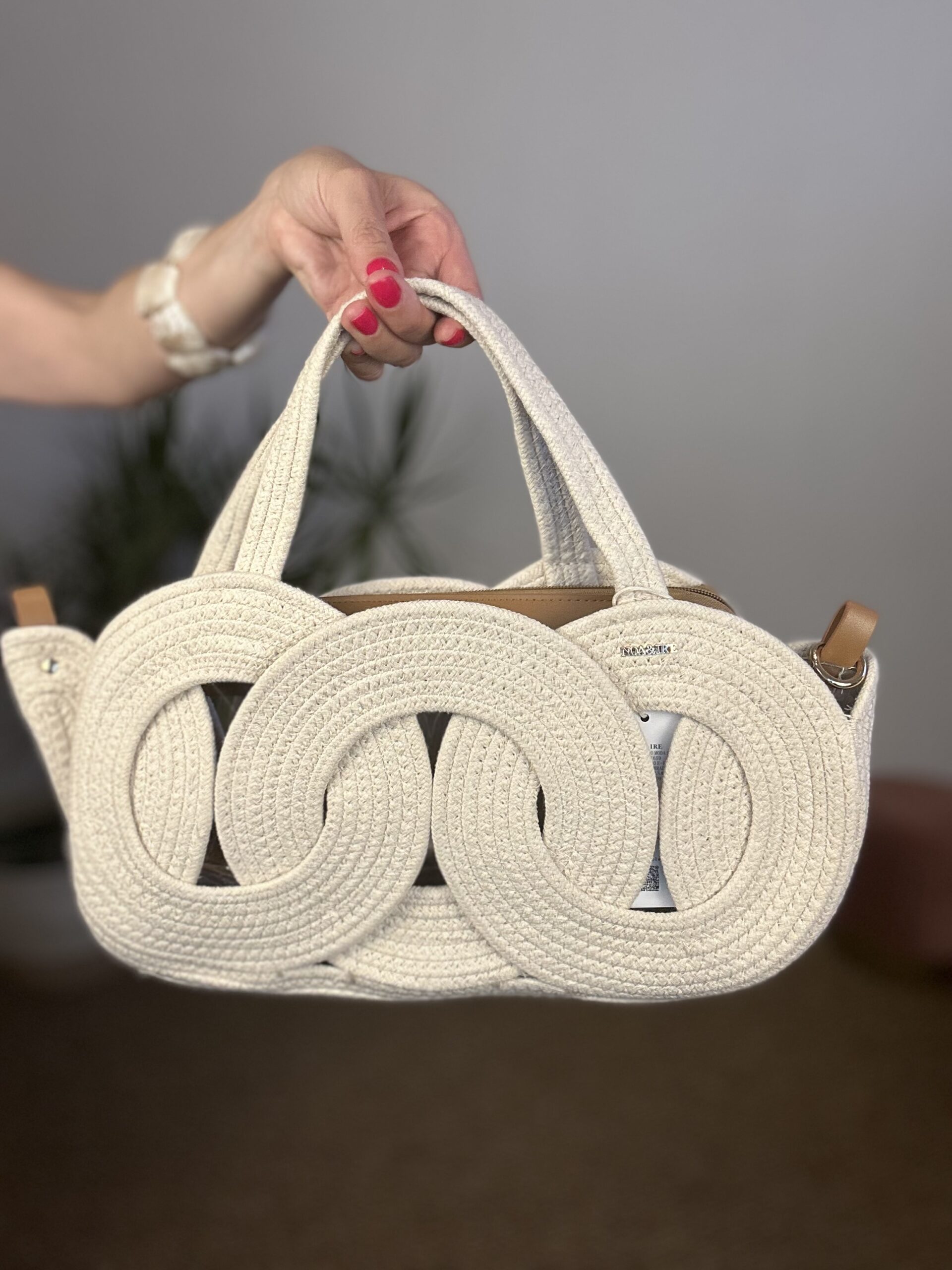 Bolso beige con círculos trenzado. Lleva asas para colgar. Bolso interior transparente.