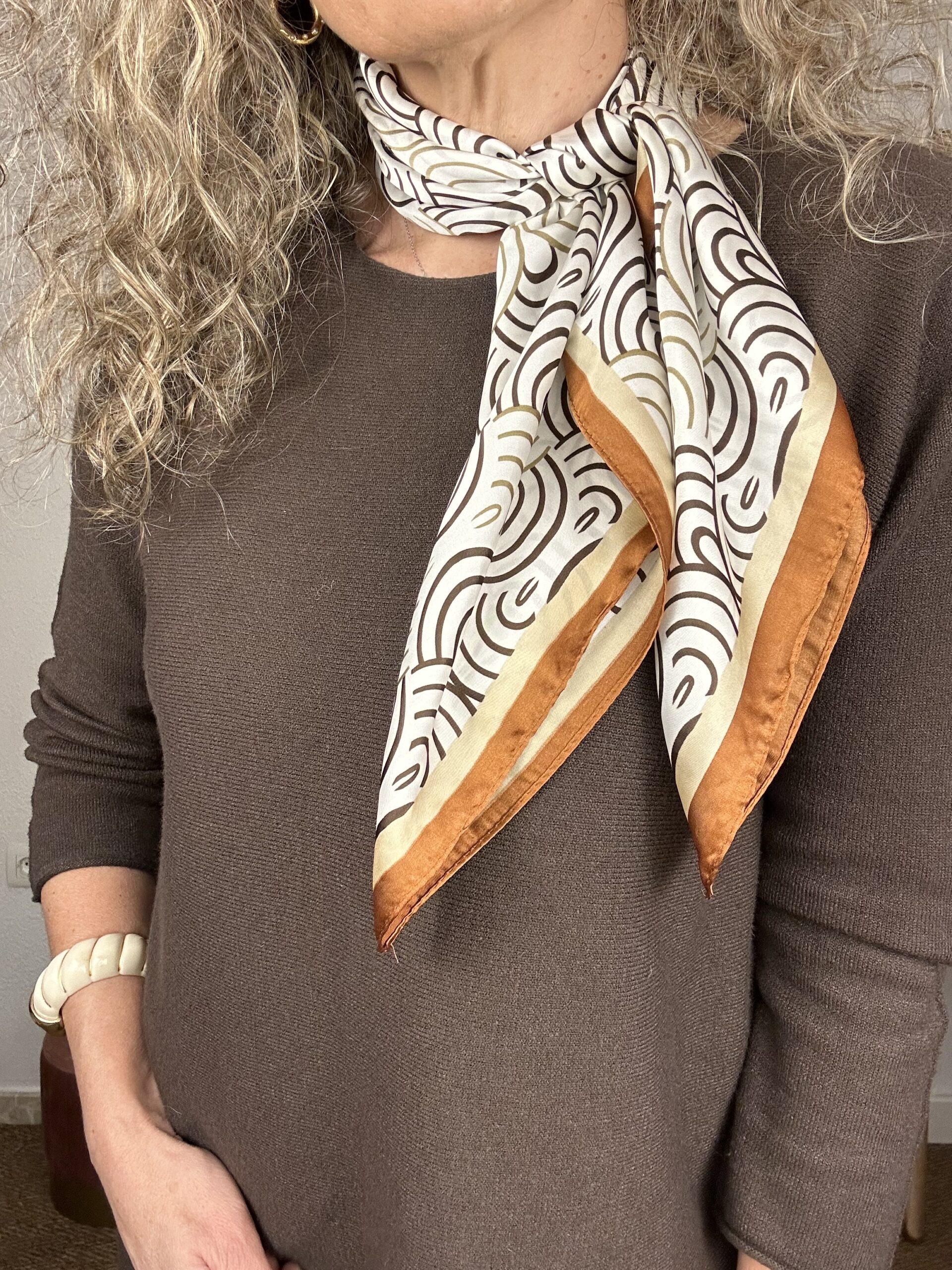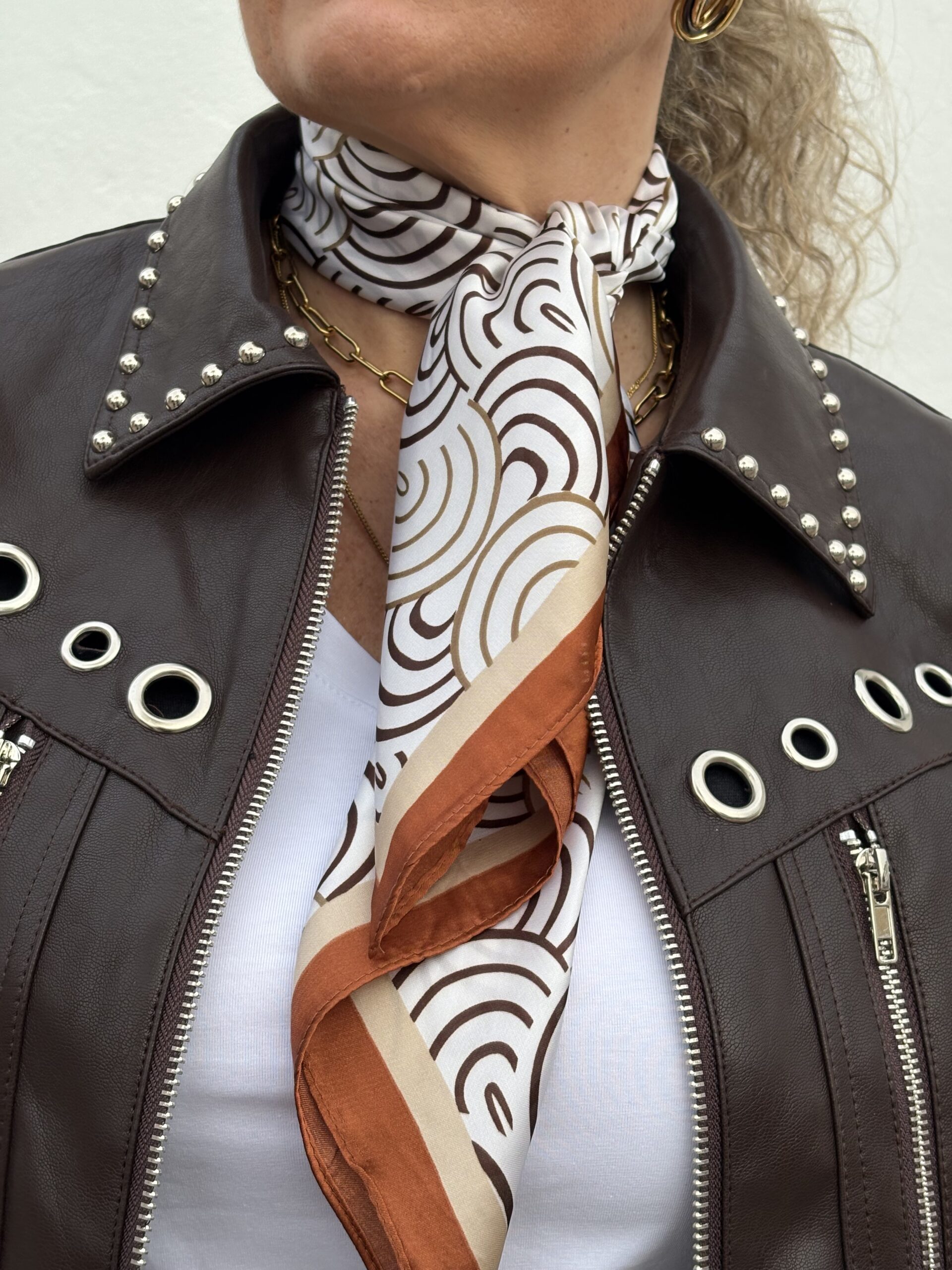 Un toque de estilo que marca la diferencia. Suave y ligero, con un diseño en tonos marrón, beige y terracota que combina con todo. Llévalo al cuello, en el pelo o en el bolso: un accesorio versátil y lleno de personalidad.
