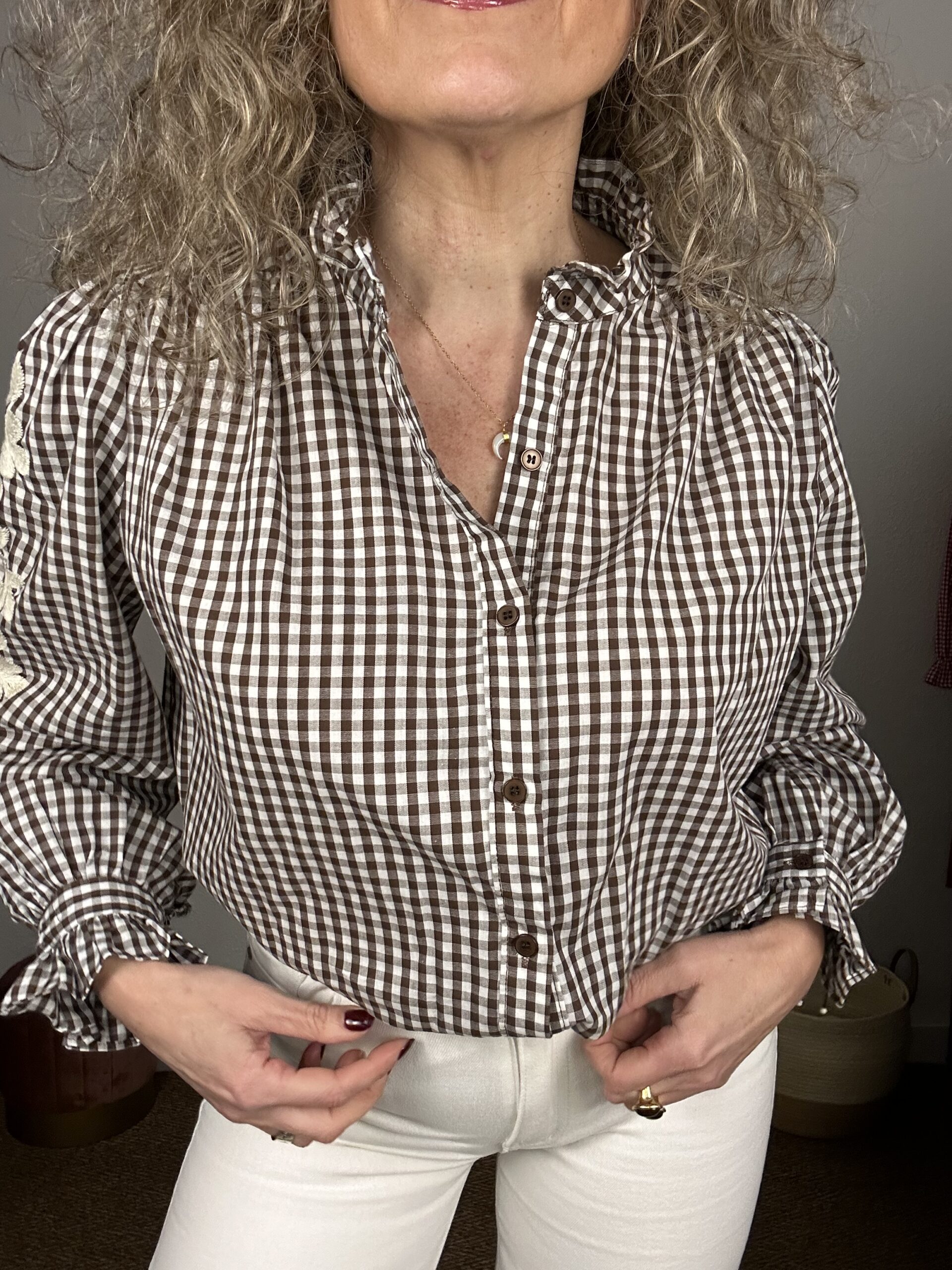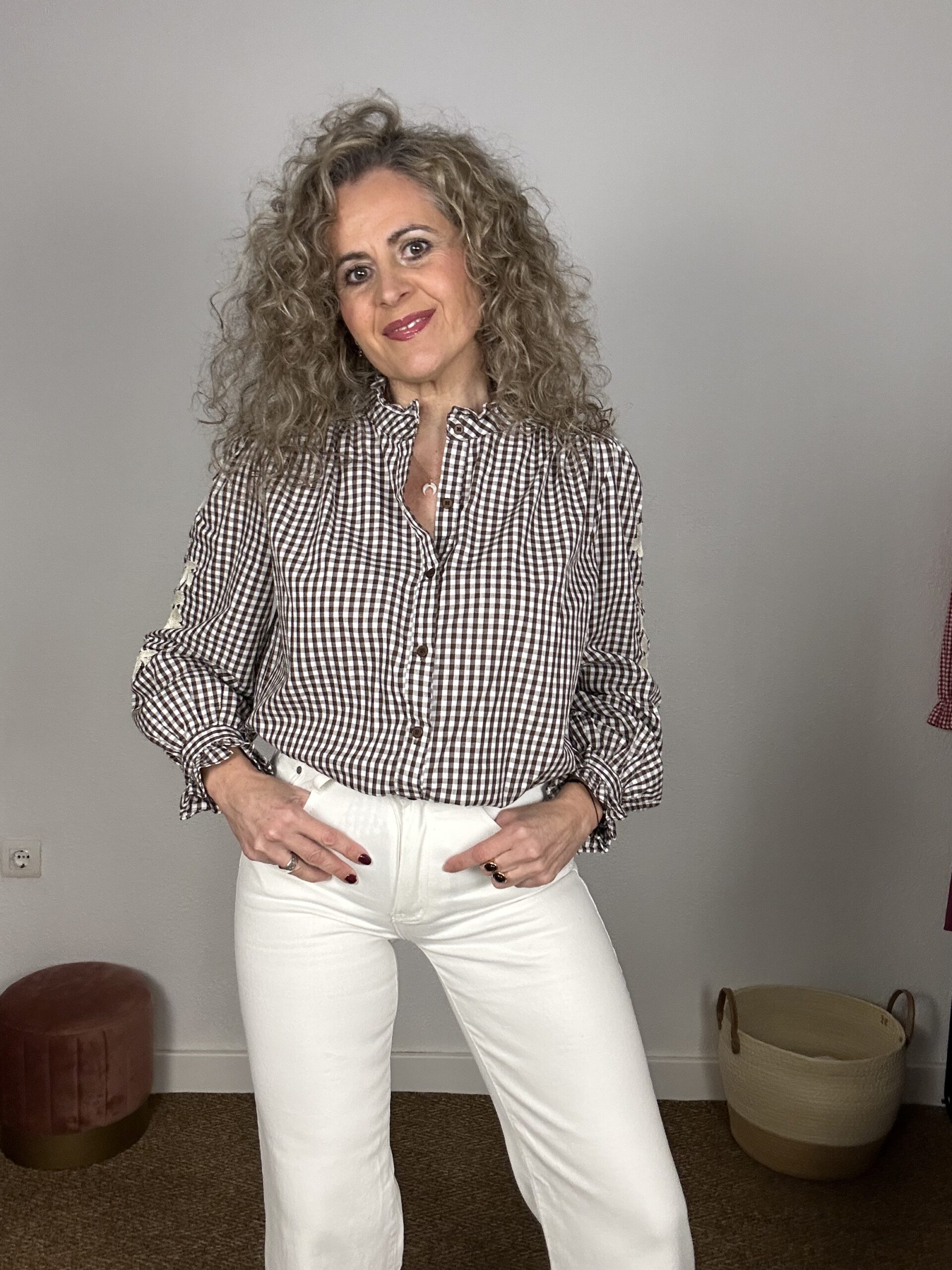 Blusa vichy marrón y blanco, Con detalle de pequeño volante en cuello subido y en puños. Cierre frontal con botones. Detalles bordados en las mangas. Una prenda femenina, elegante y fácil de combinar para el día a día.