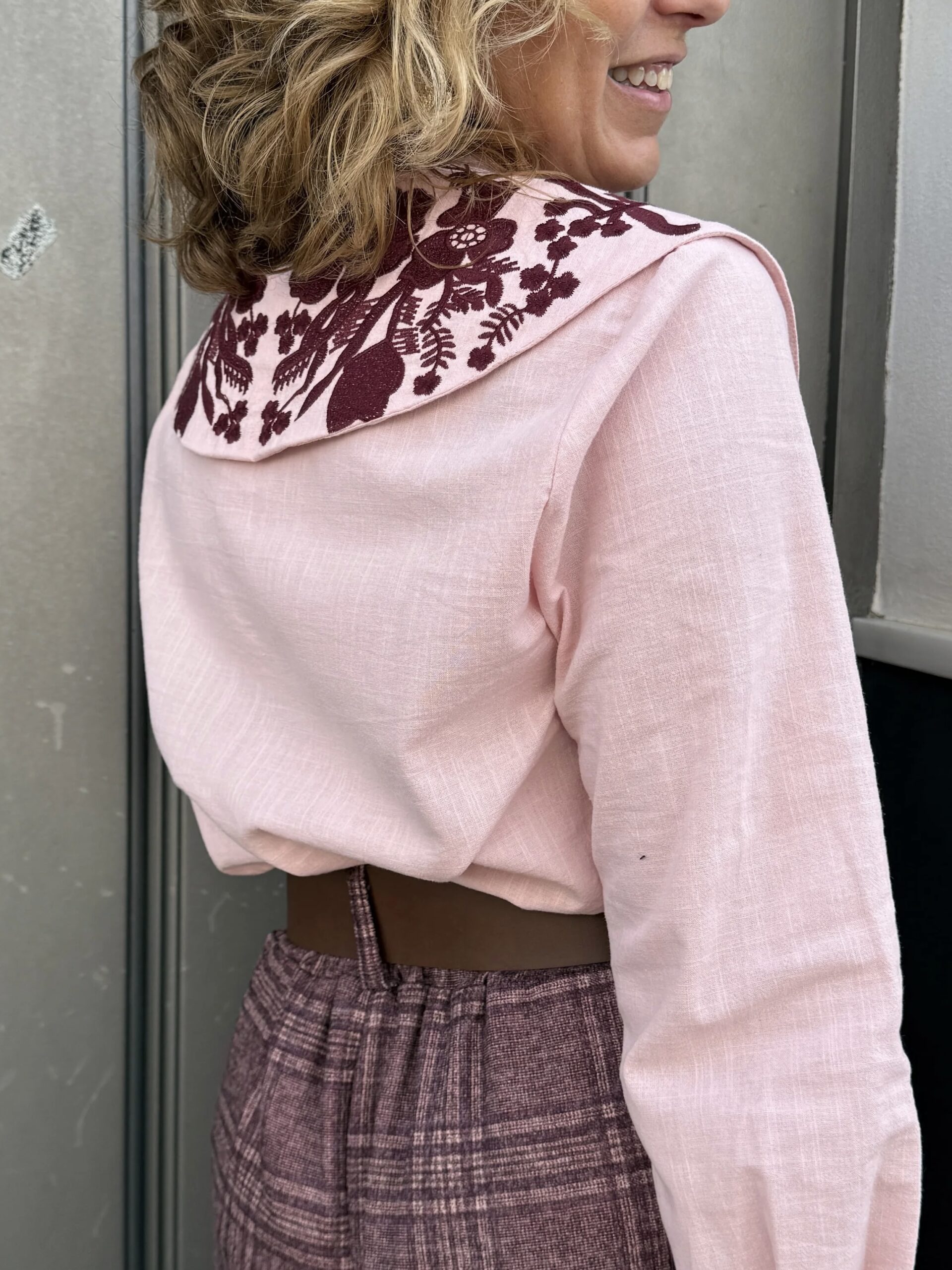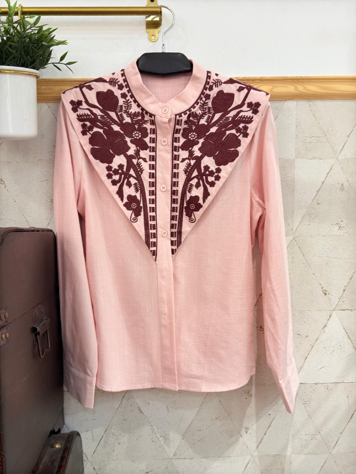 Disponible en color rosa con bordado burdeos. Botonadura en color rosa.