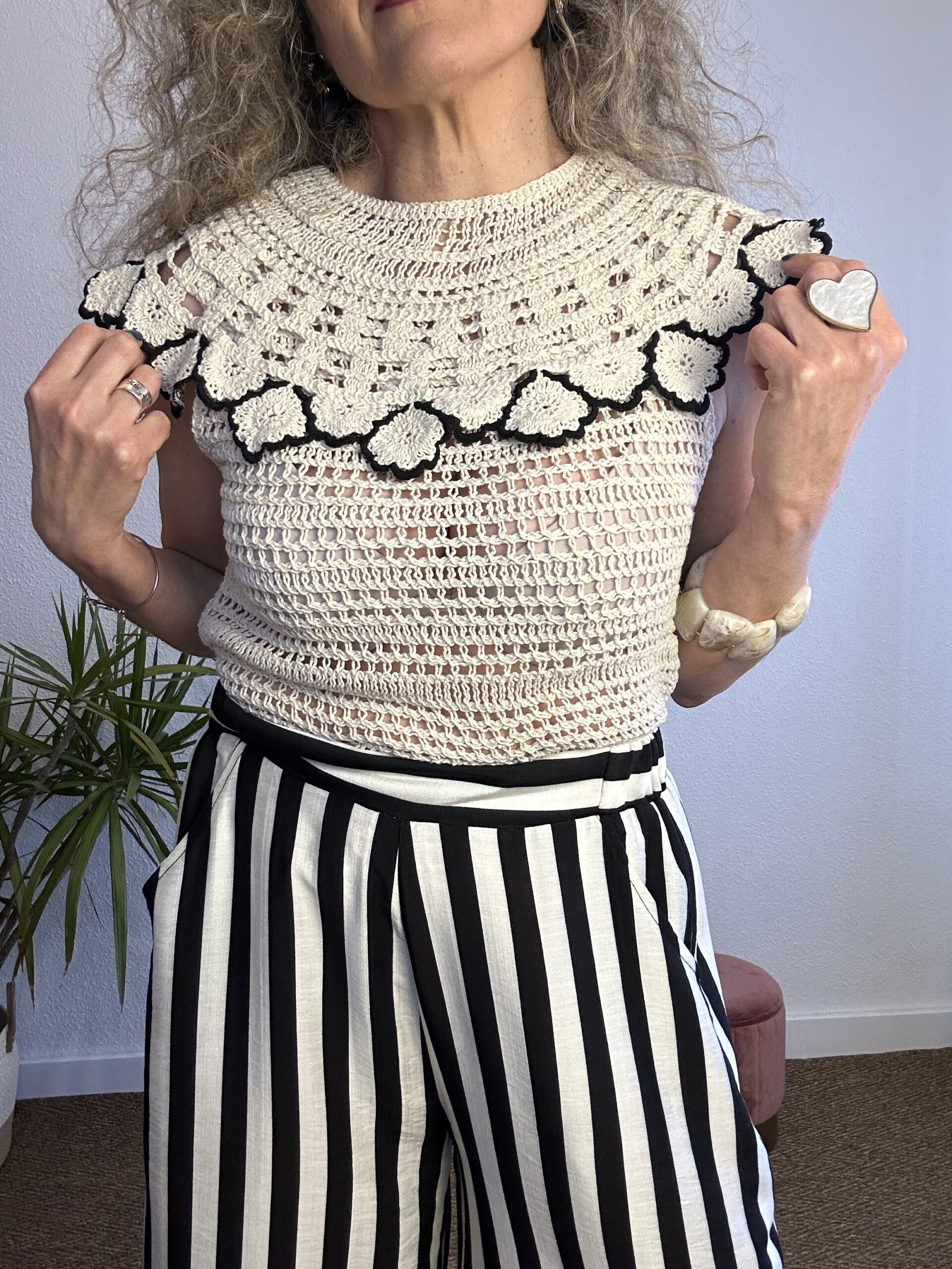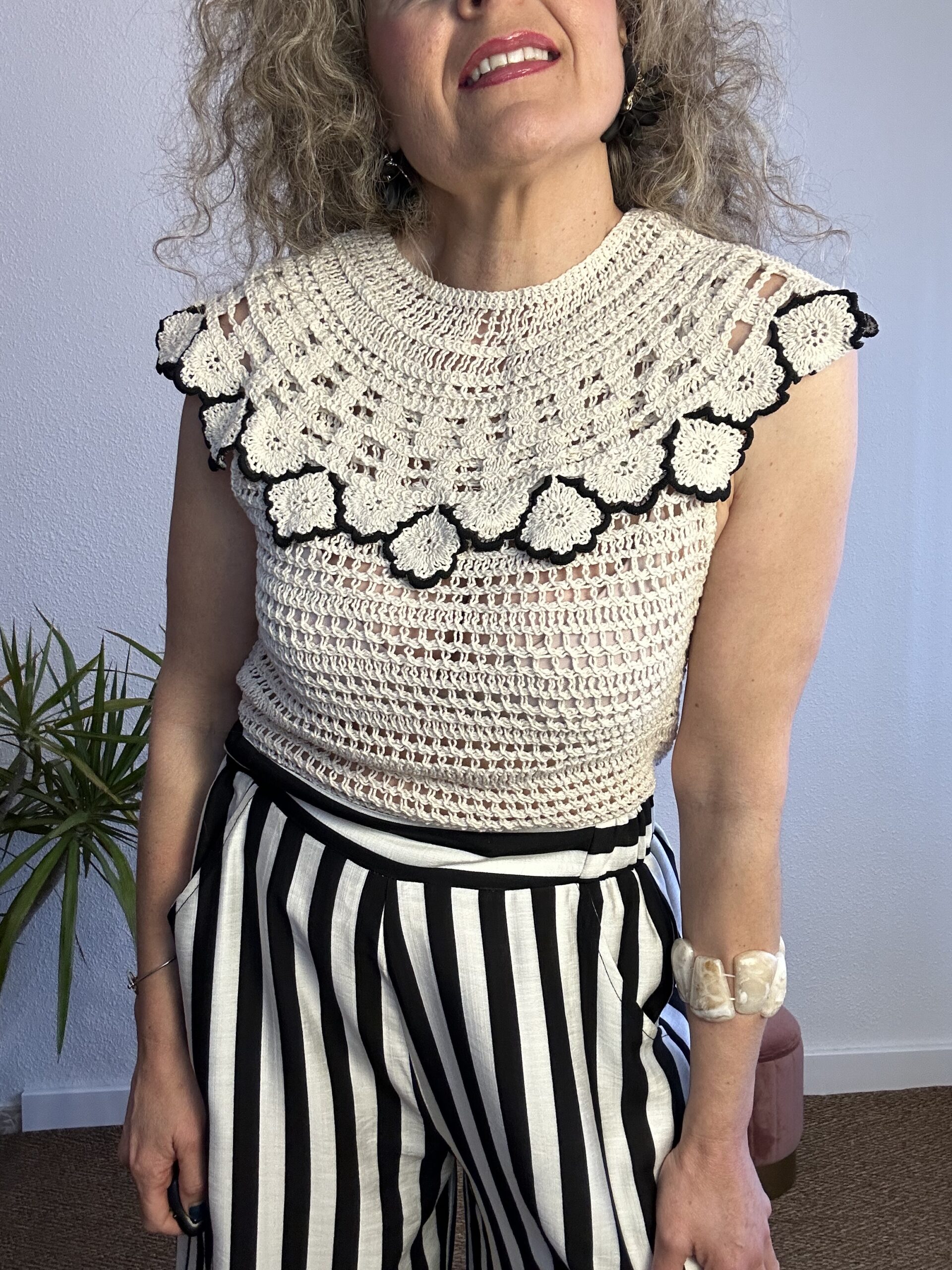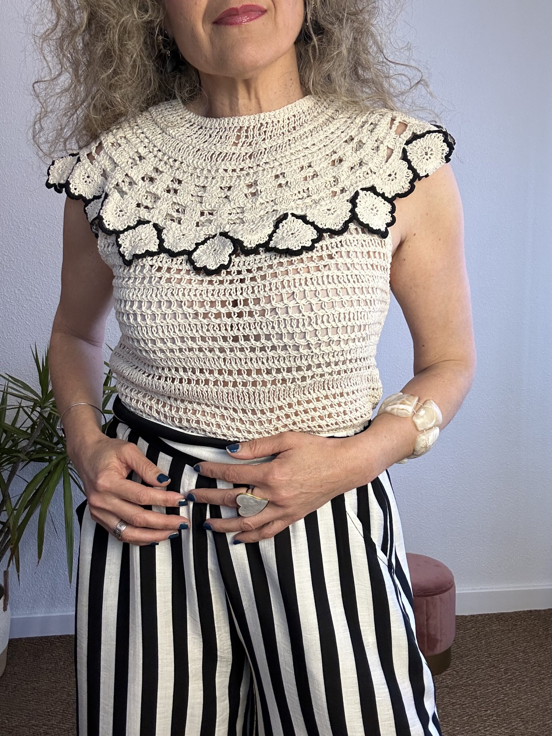 Top sin mangas de crochet en color crudo. Detalles floral en el cuello y bordes en negro. Cierre mediante botón.