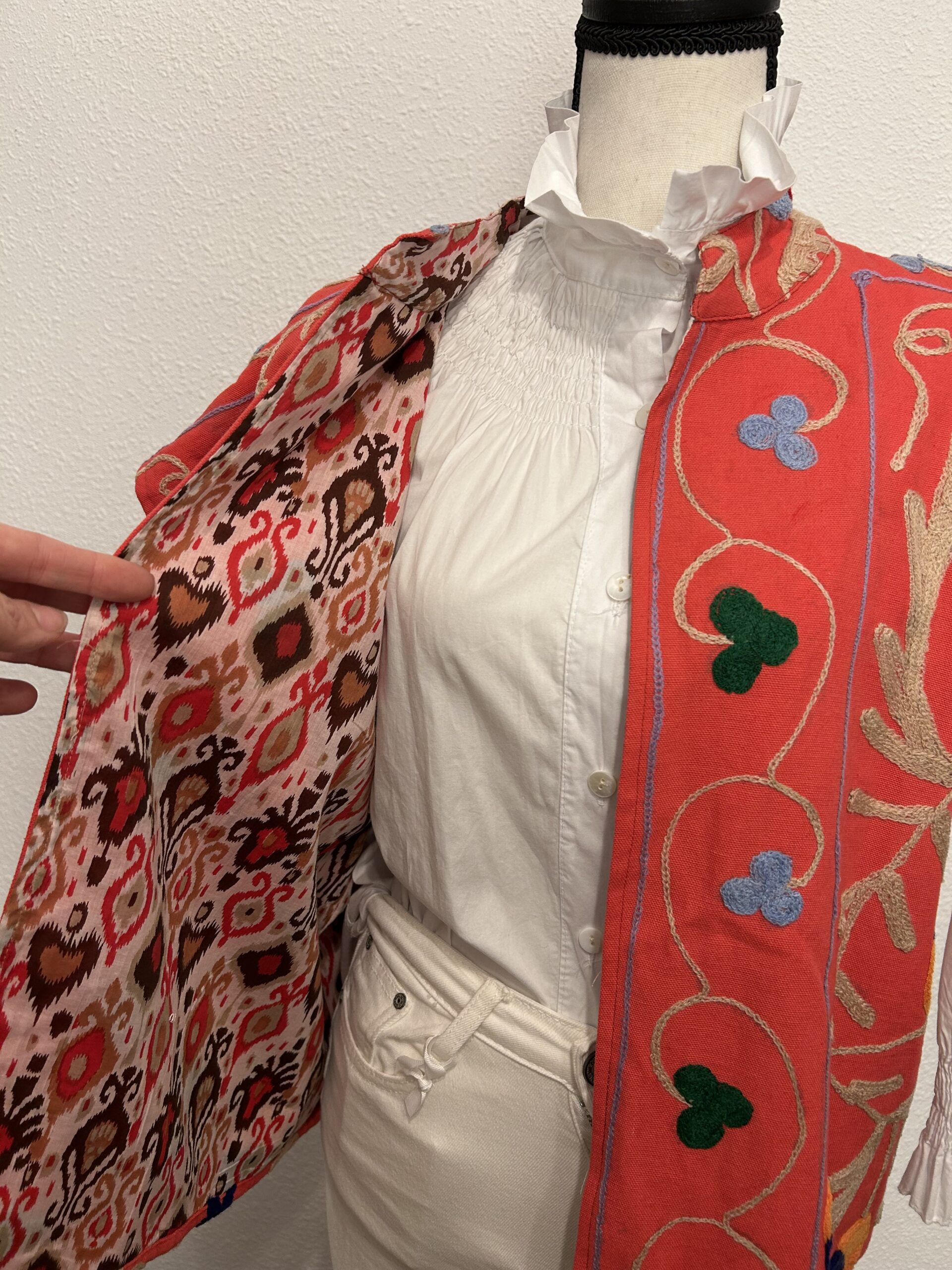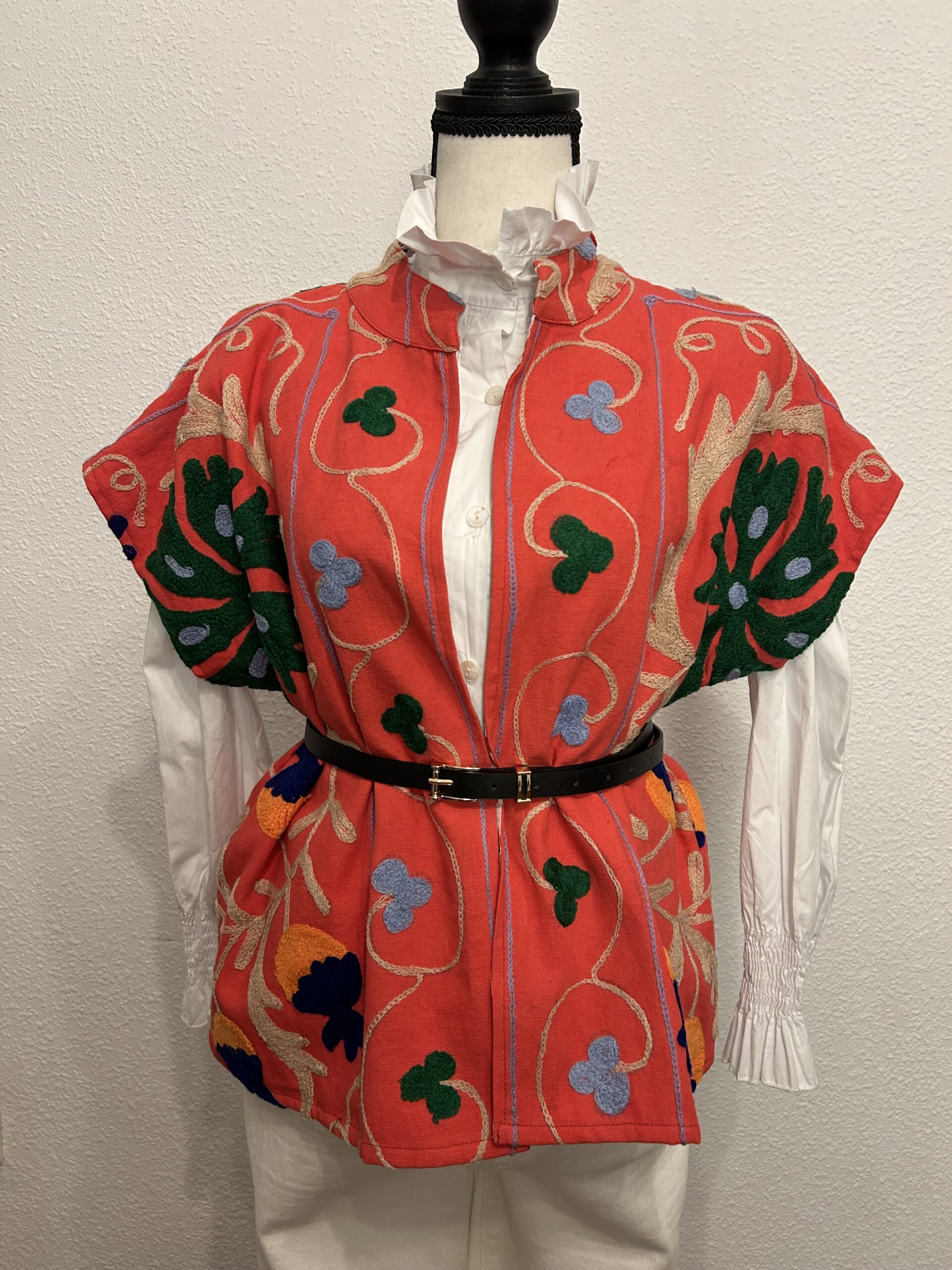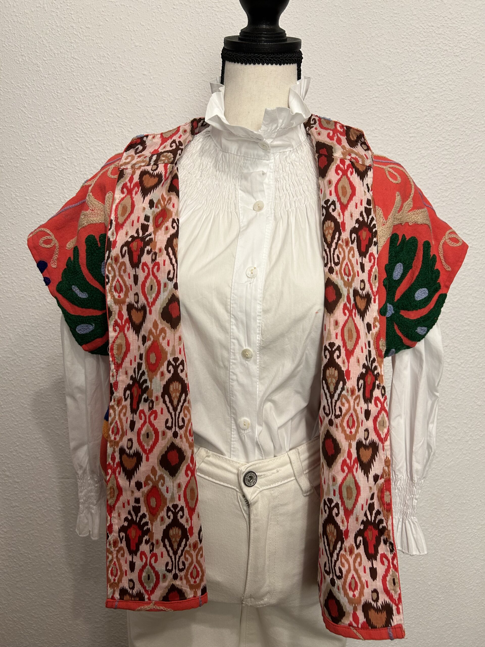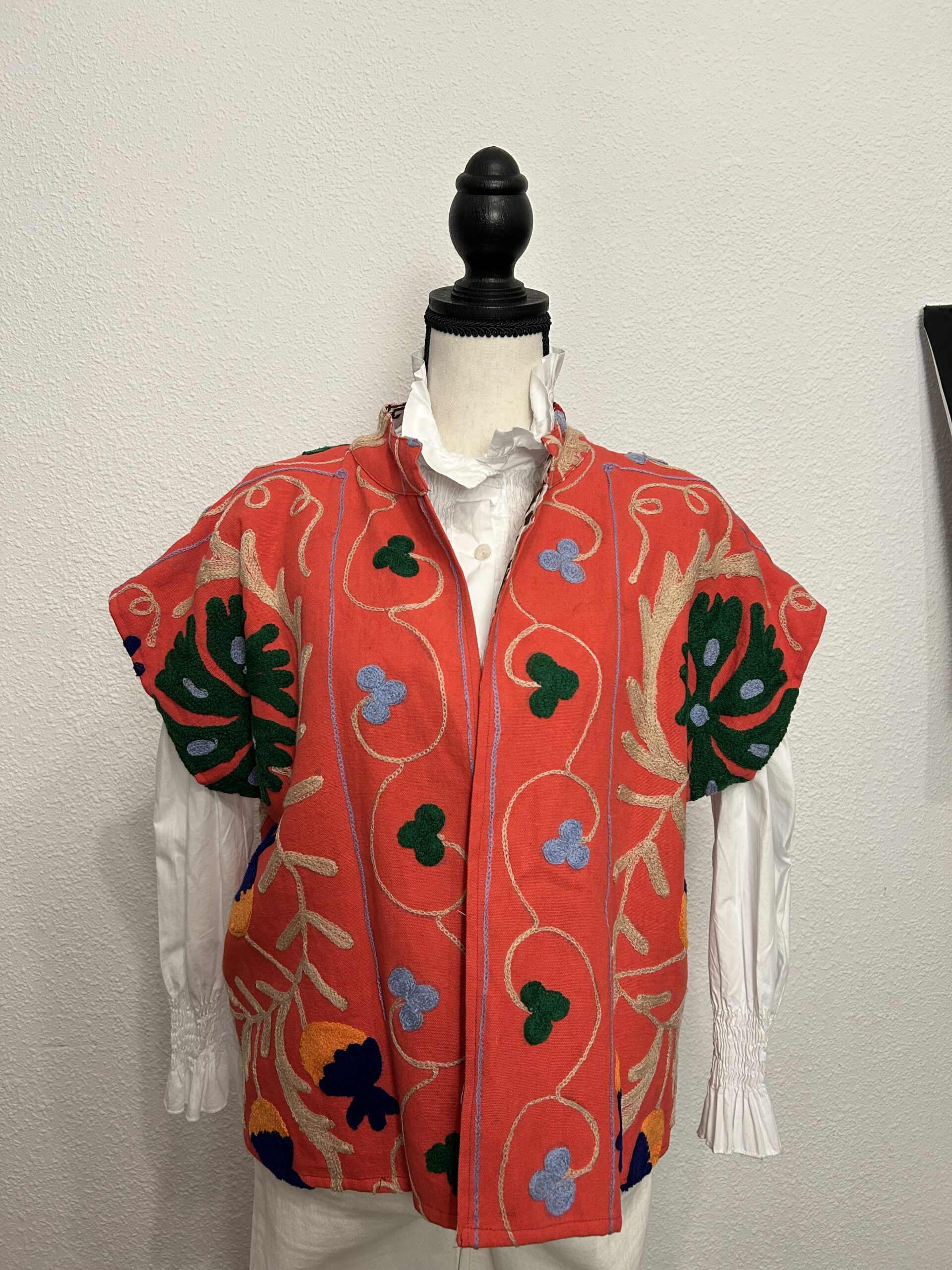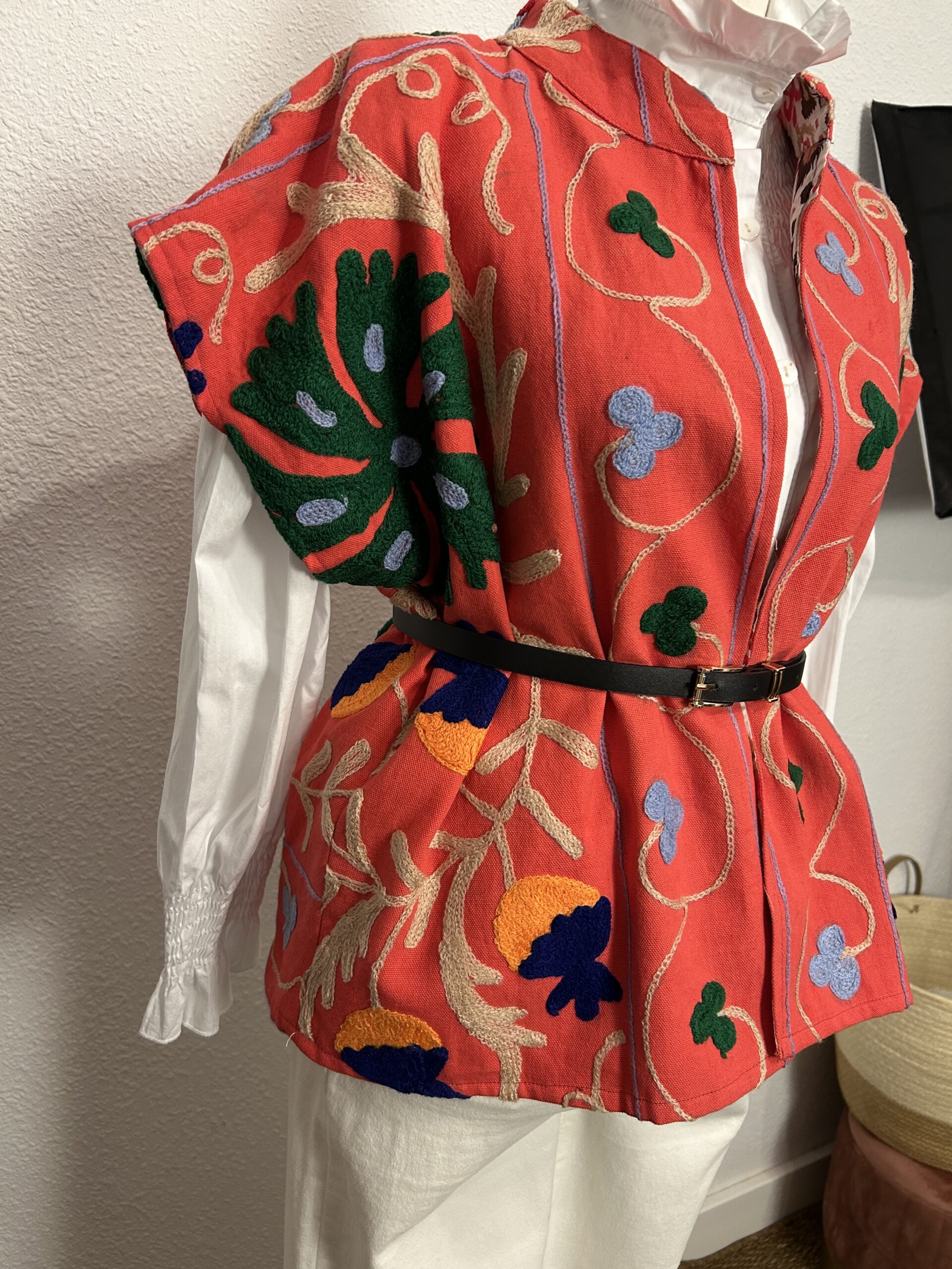 Chaleco bordado artesanal de India en algodón coral con bordados florales multicolor y forro interior estampado.
