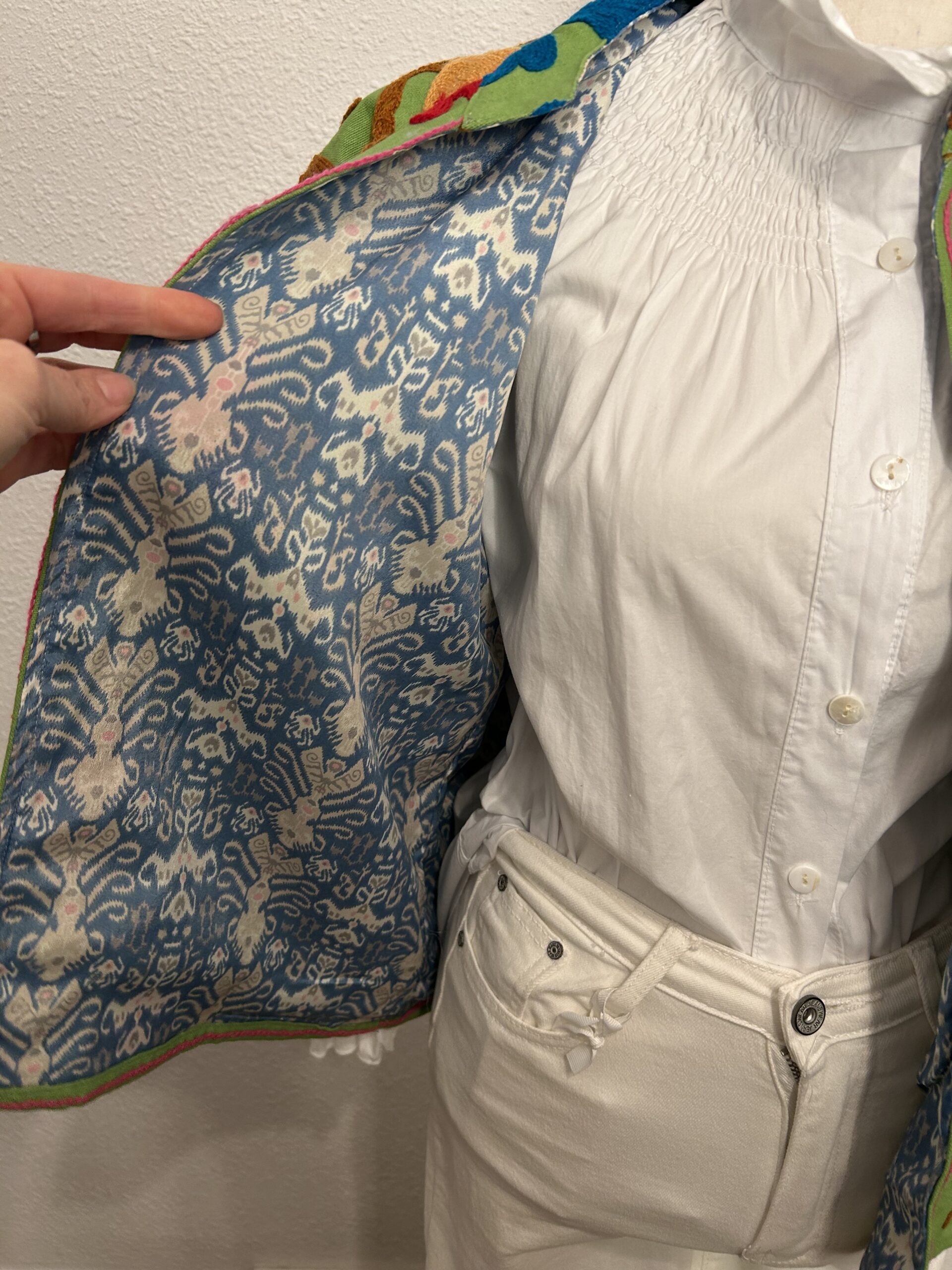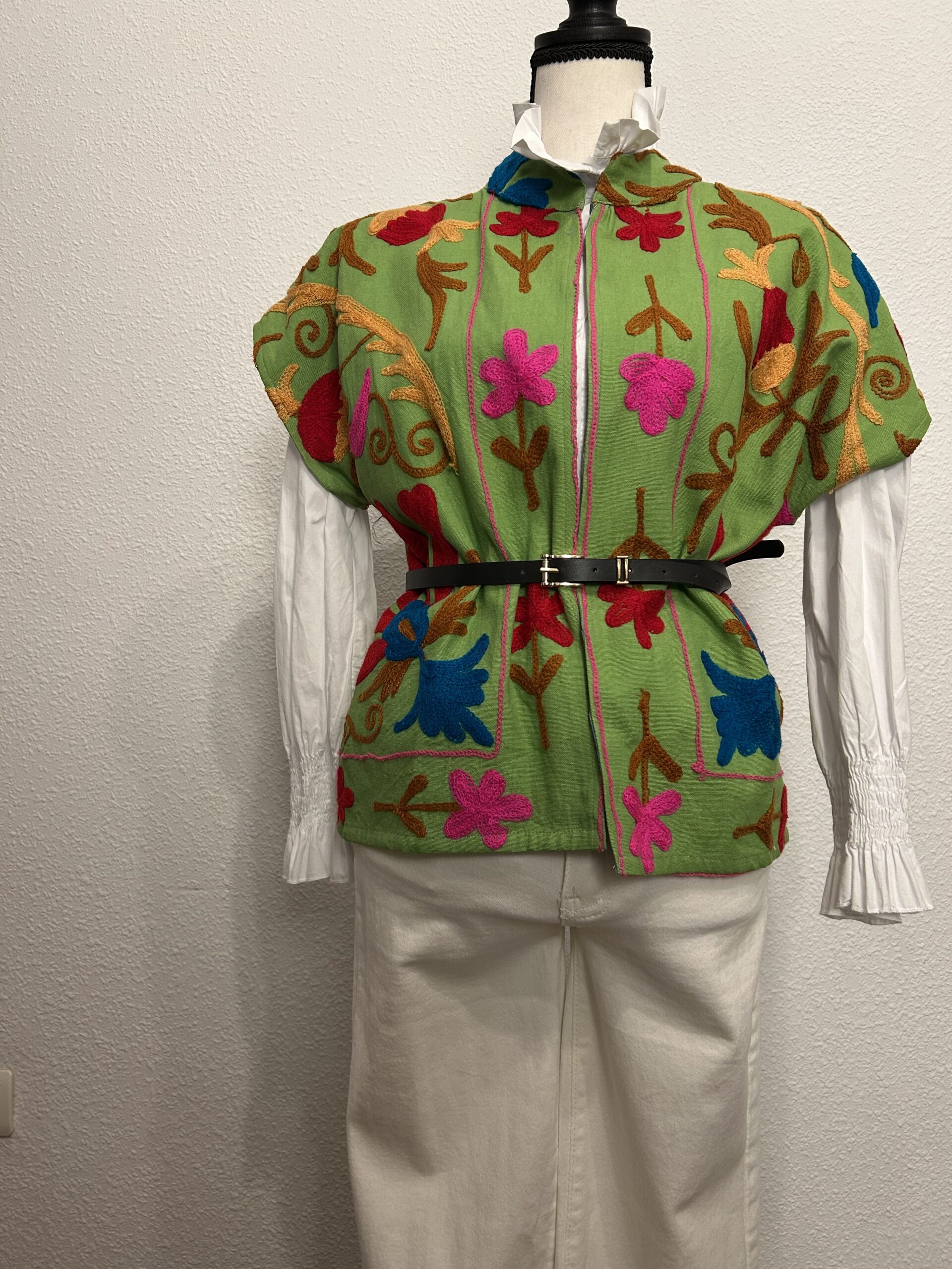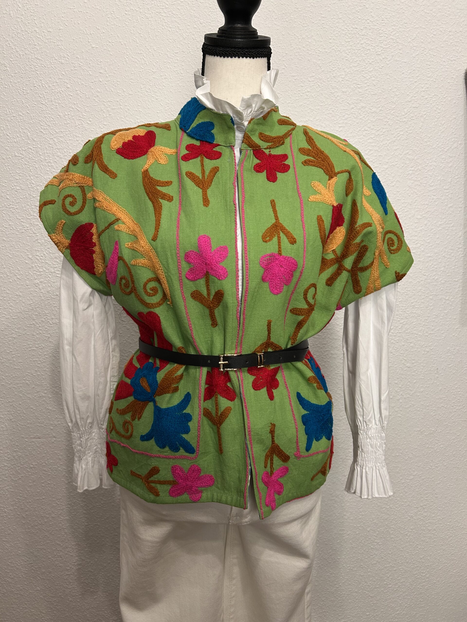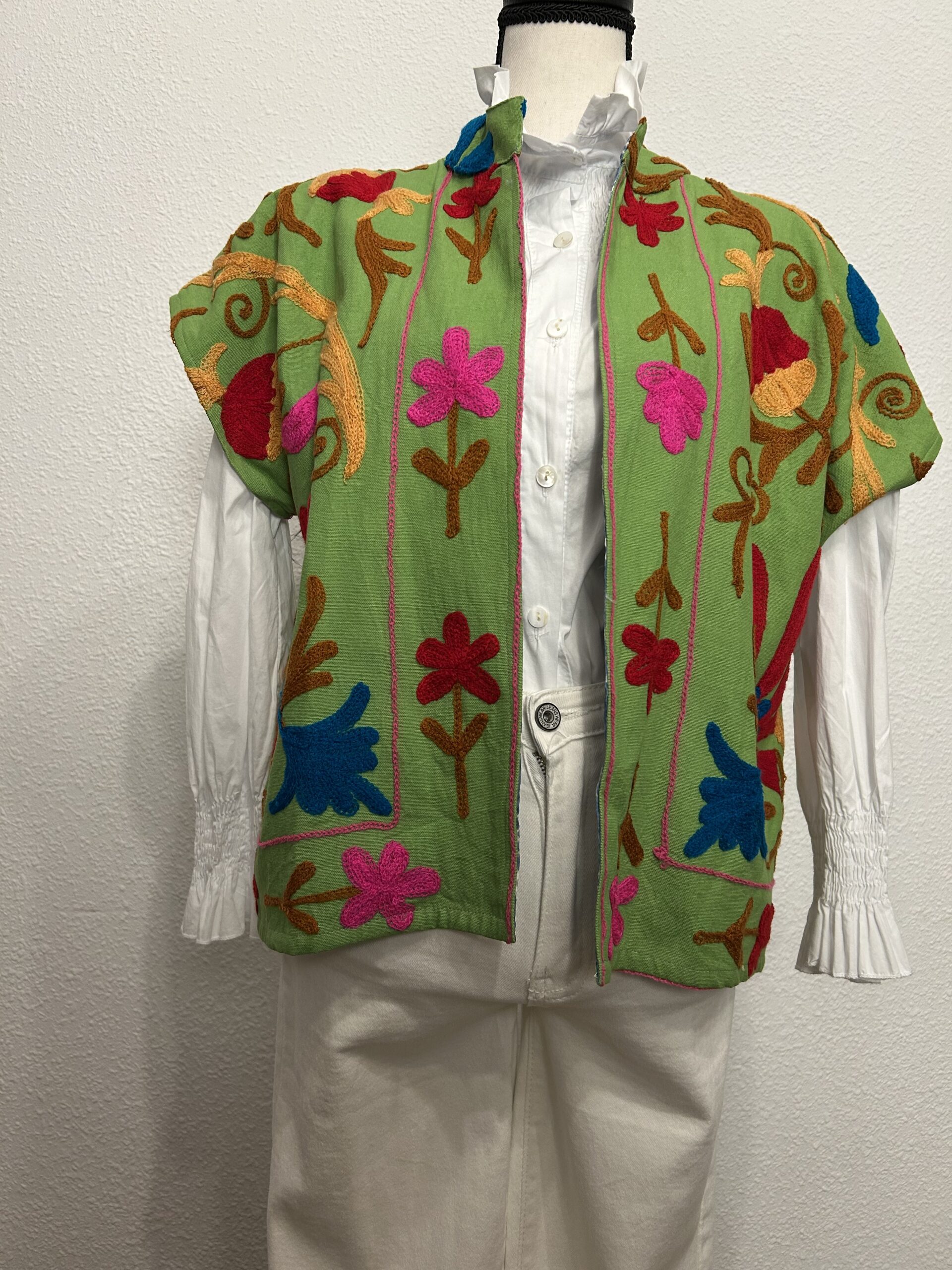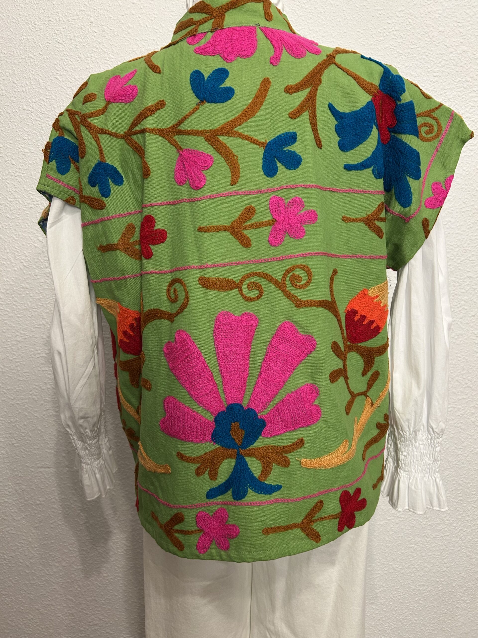 Chaleco bordado artesanal de India en algodón verde con bordados florales multicolor y forro interior estampado.