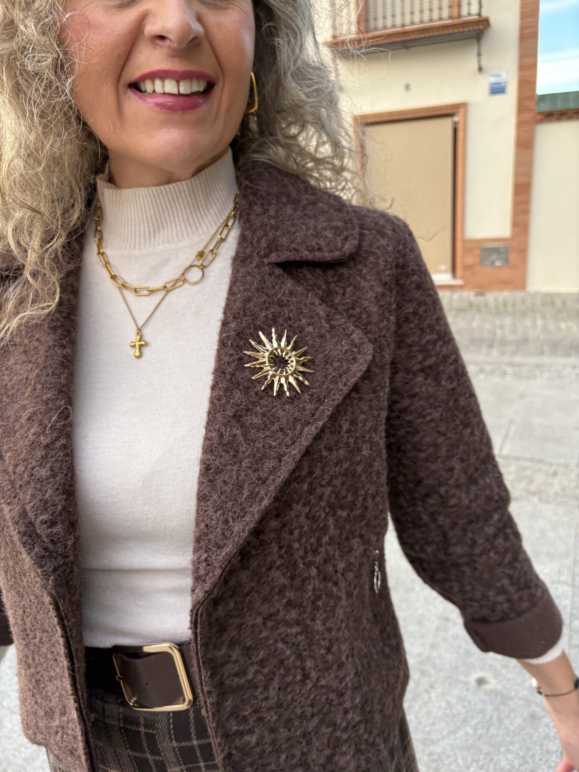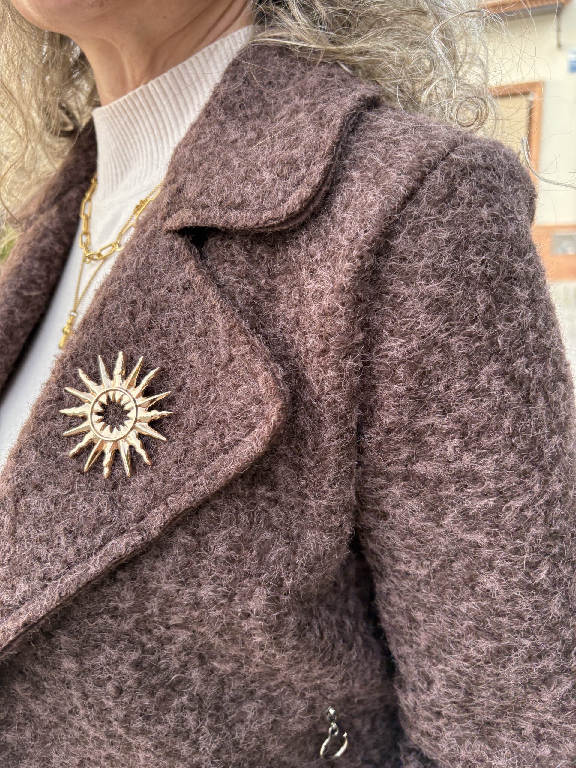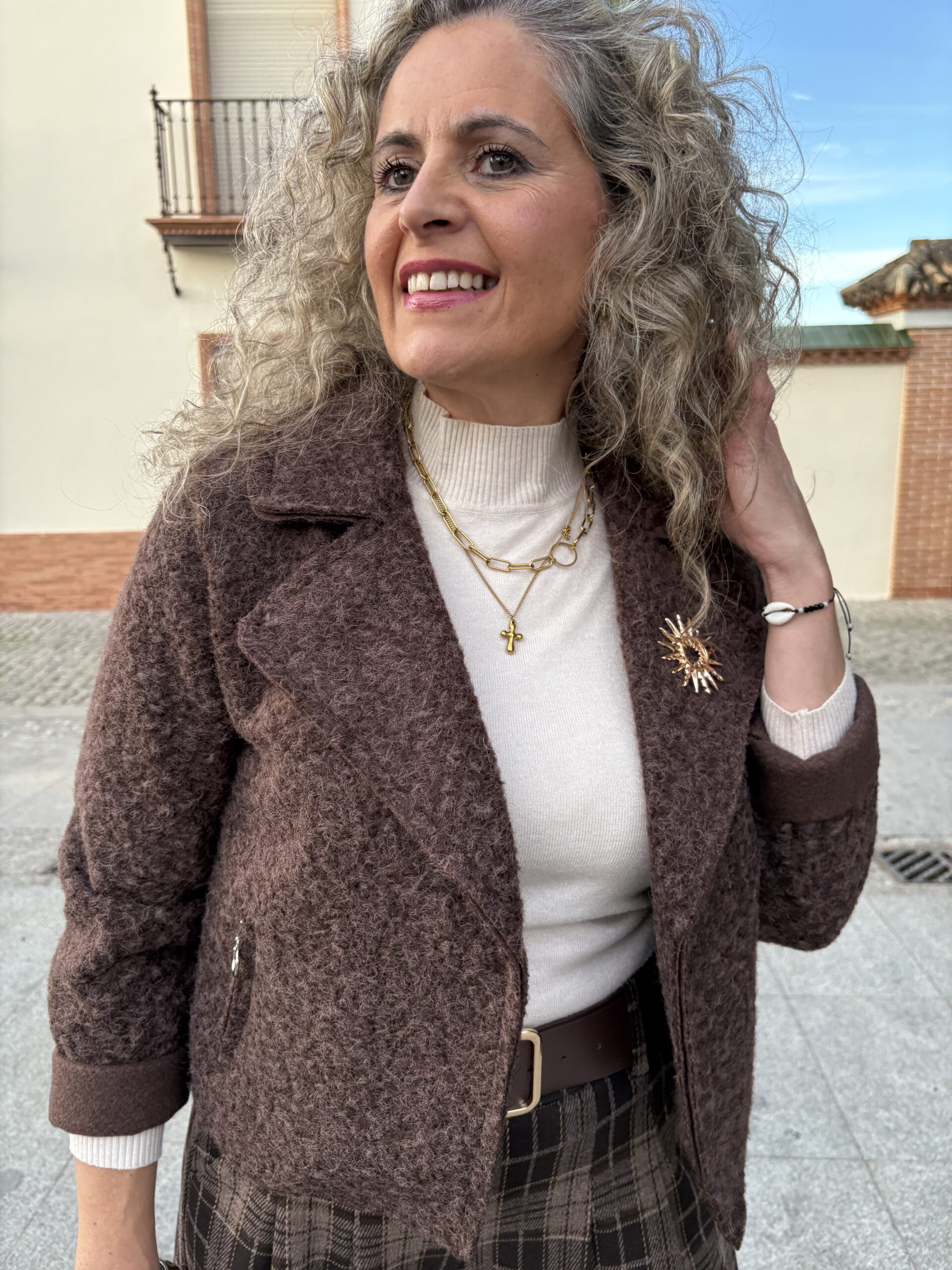 Chaqueta de punto bouclé en tono marrón, suave y con broche en la solapa dorado. De corte recto y estilo cómodo, lleva bolsillos falsos en los laterales con cremallera. Talla única se adapta de la S a la L. ( 36 /42)Ideal para combinar con looks casuales o elegantes.