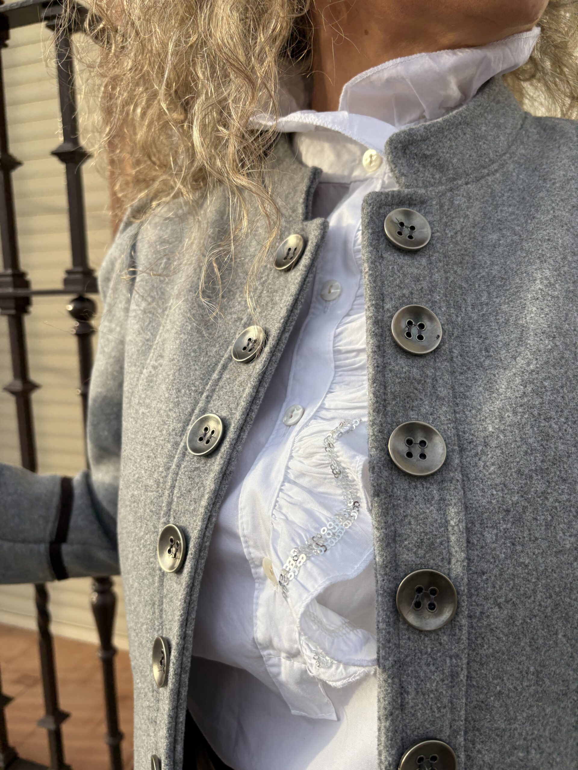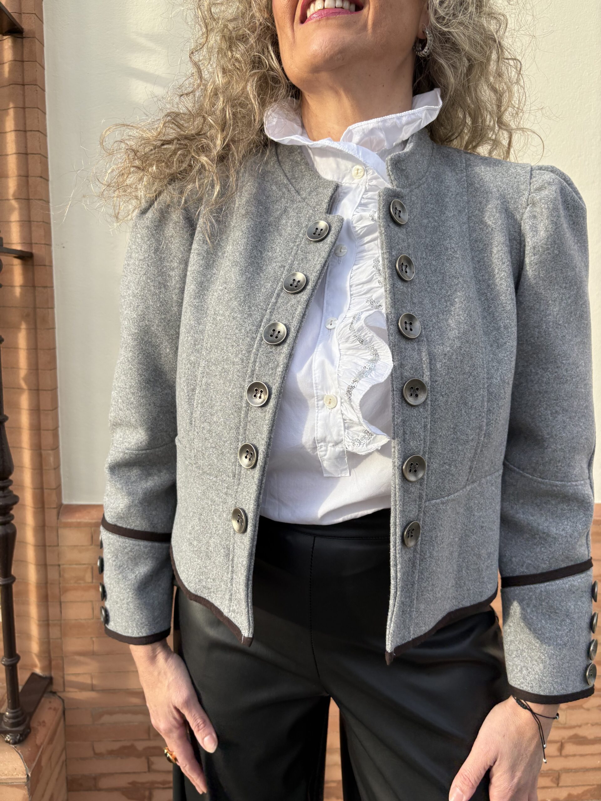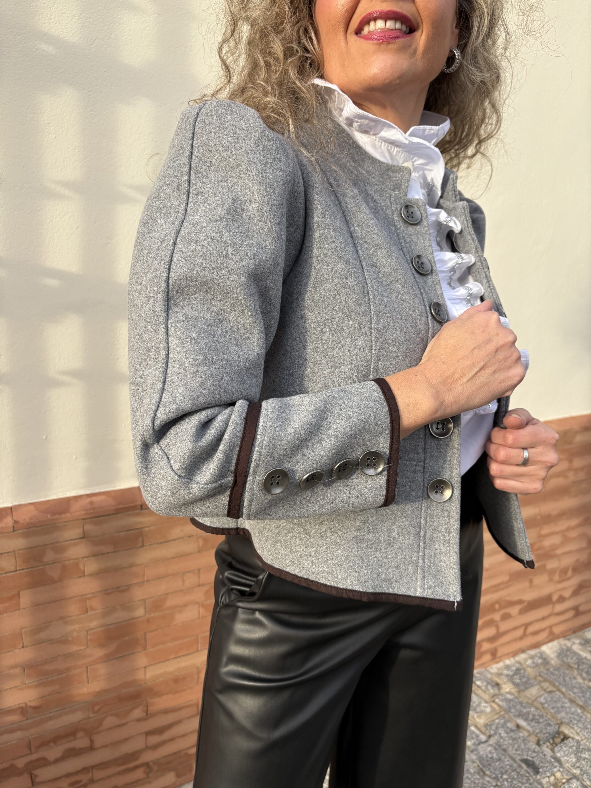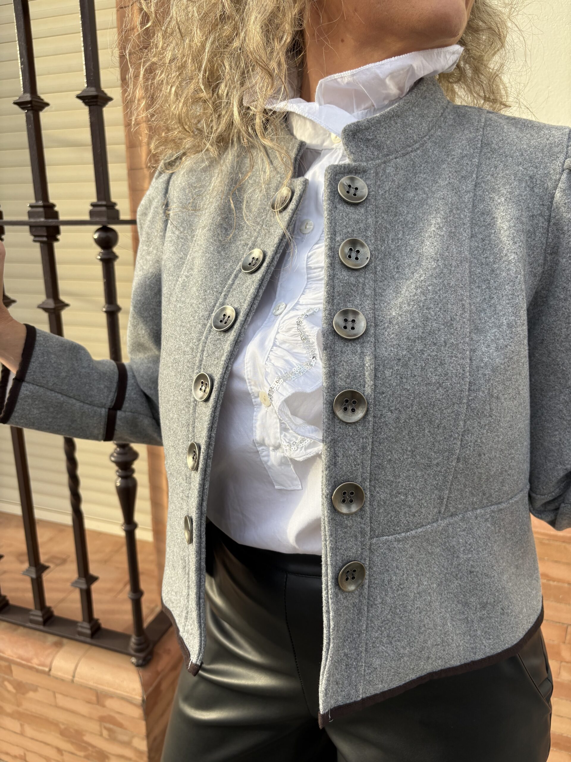 Chaqueta gris de paño. Botonadura en el bajo de la manga y en la parte de delantera.