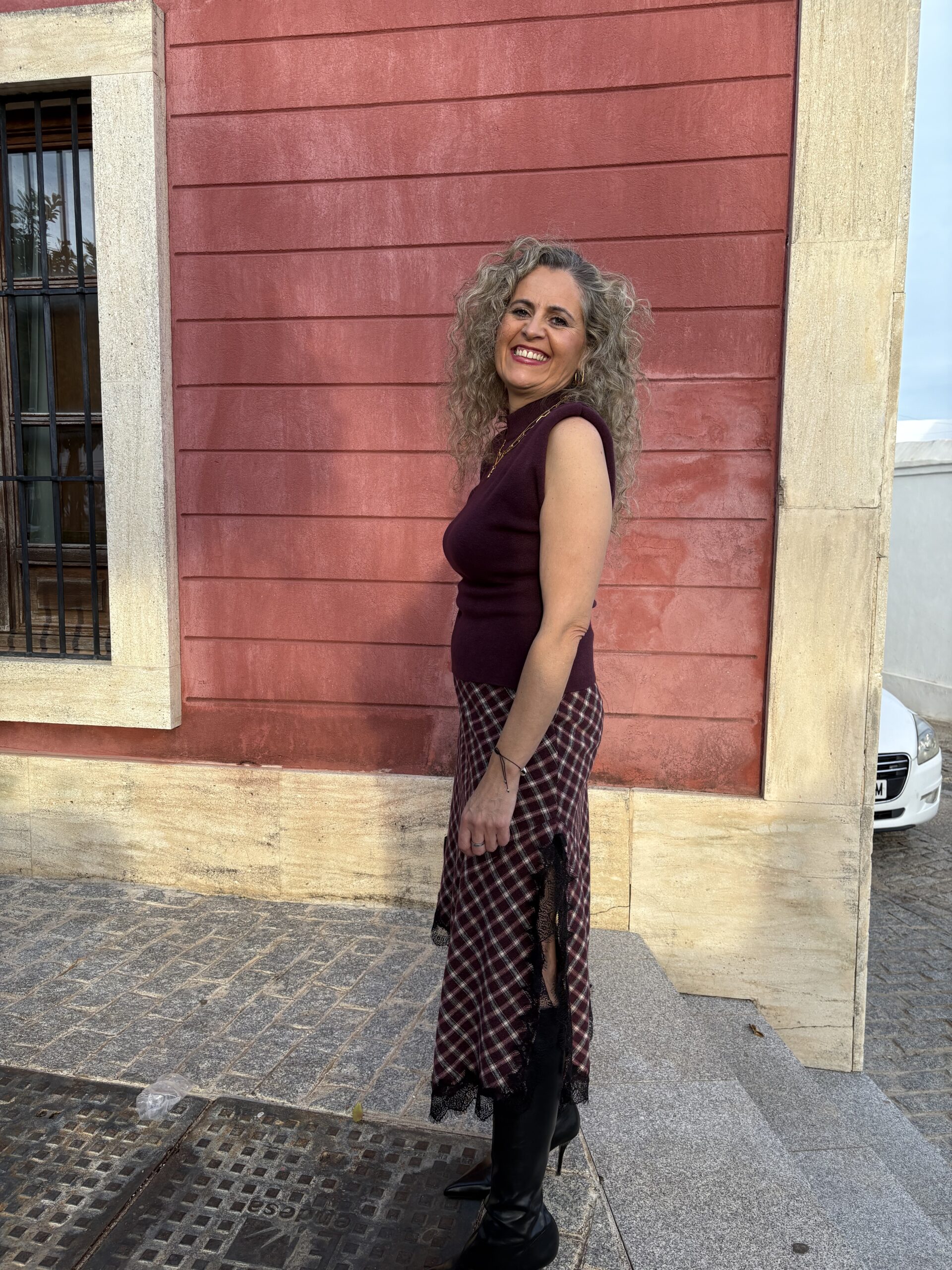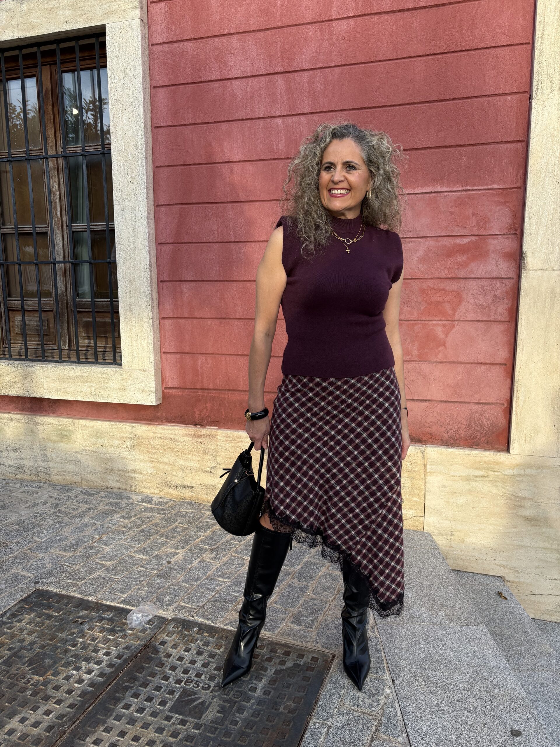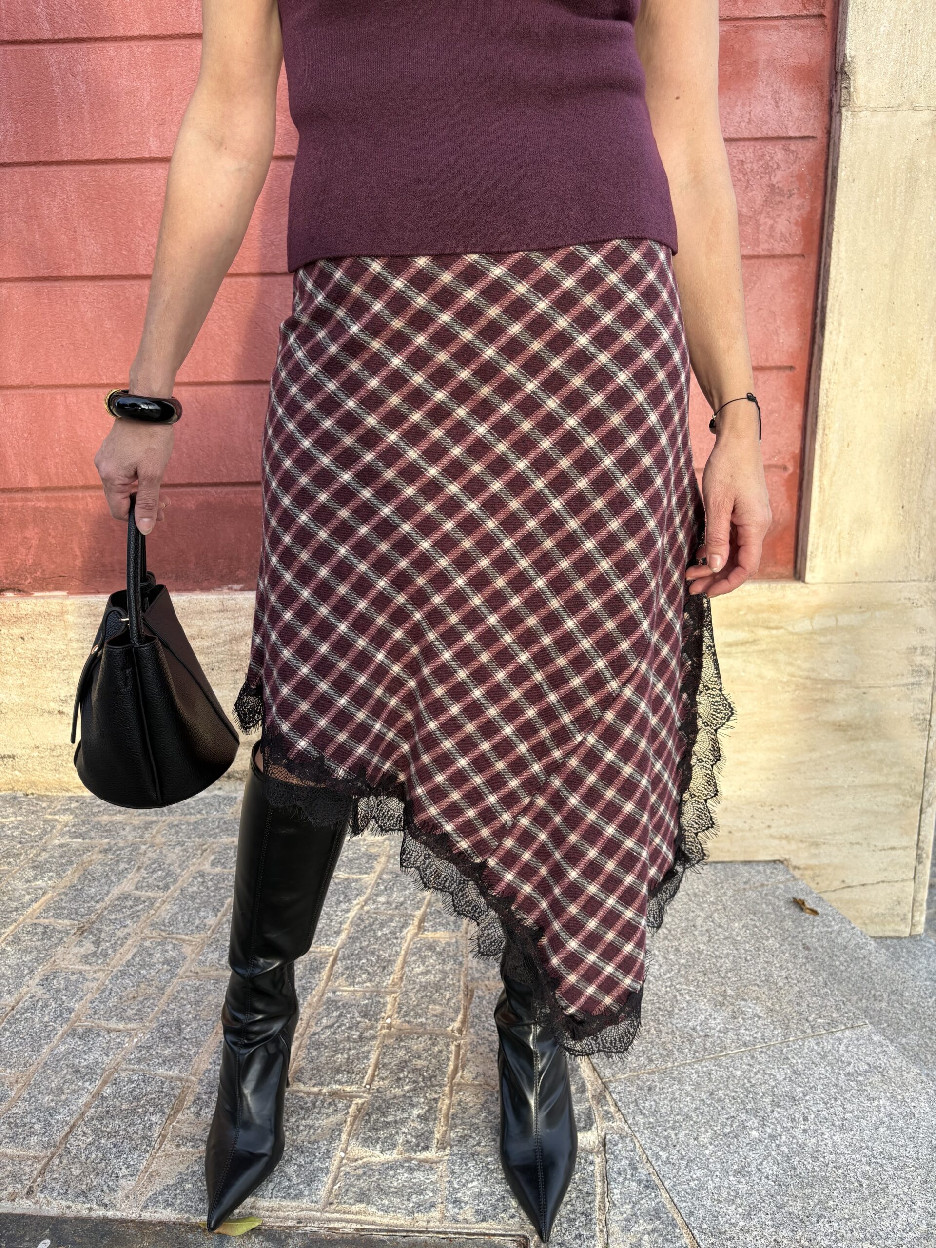 Falda asimétrica cuadros Confeccionada en un tejido suave de cuadros en tonos burdeos, beige y negro, presenta un diseño asimétrico con abertura lateral y goma en la cintura, lleva un El delicado ribete de encaje negro en el bajo añade un aire femenino y sofisticado. Perfecta para combinar con botas altas y un top ajustado. Talla única