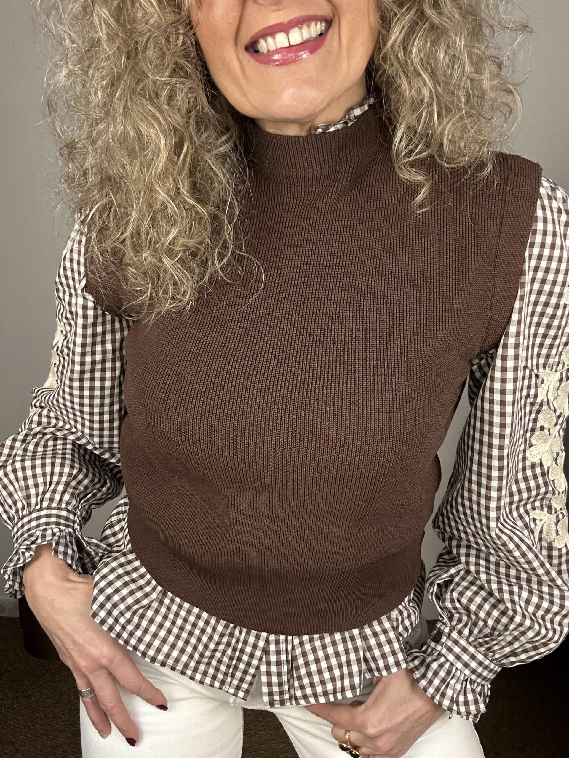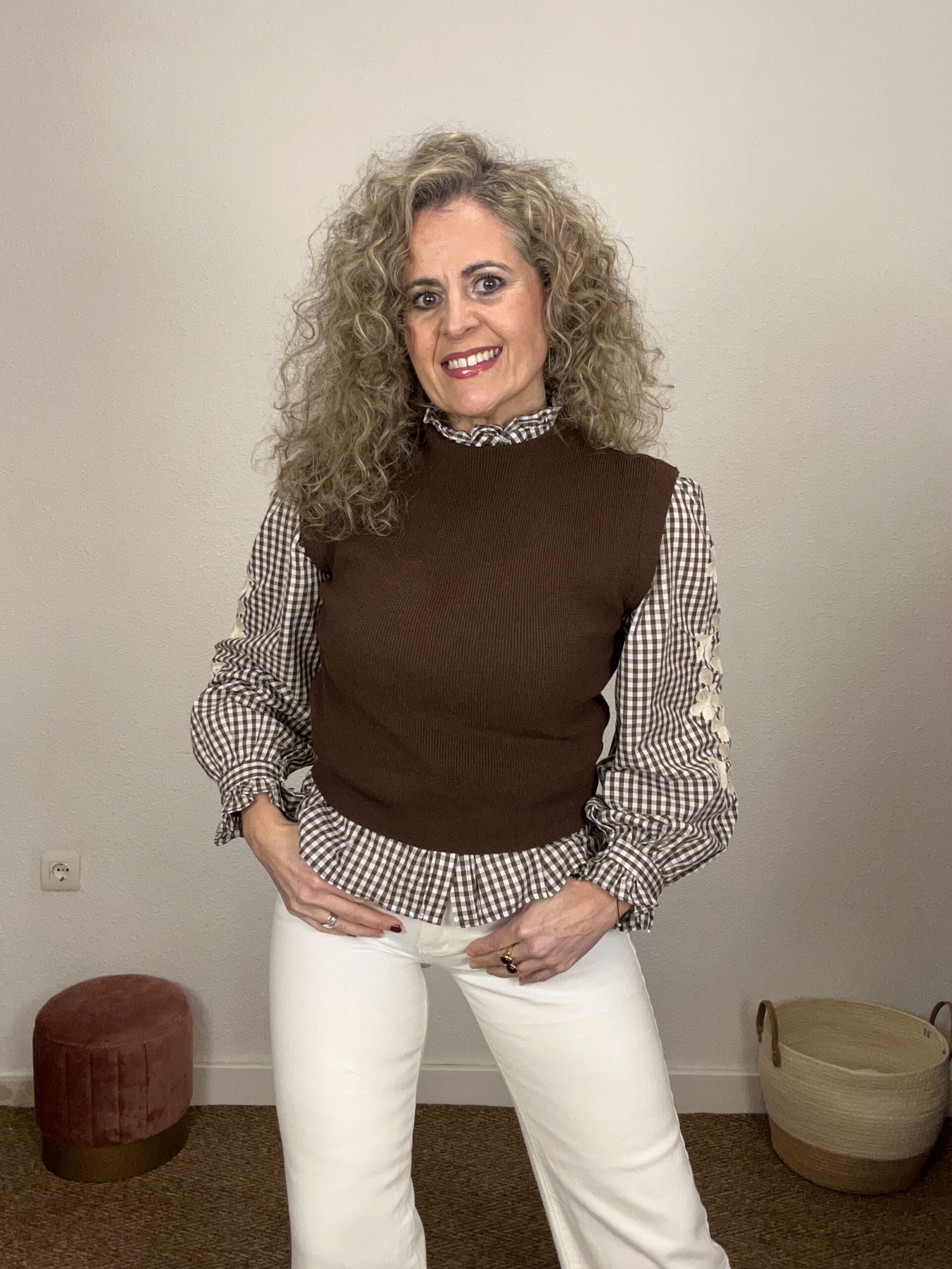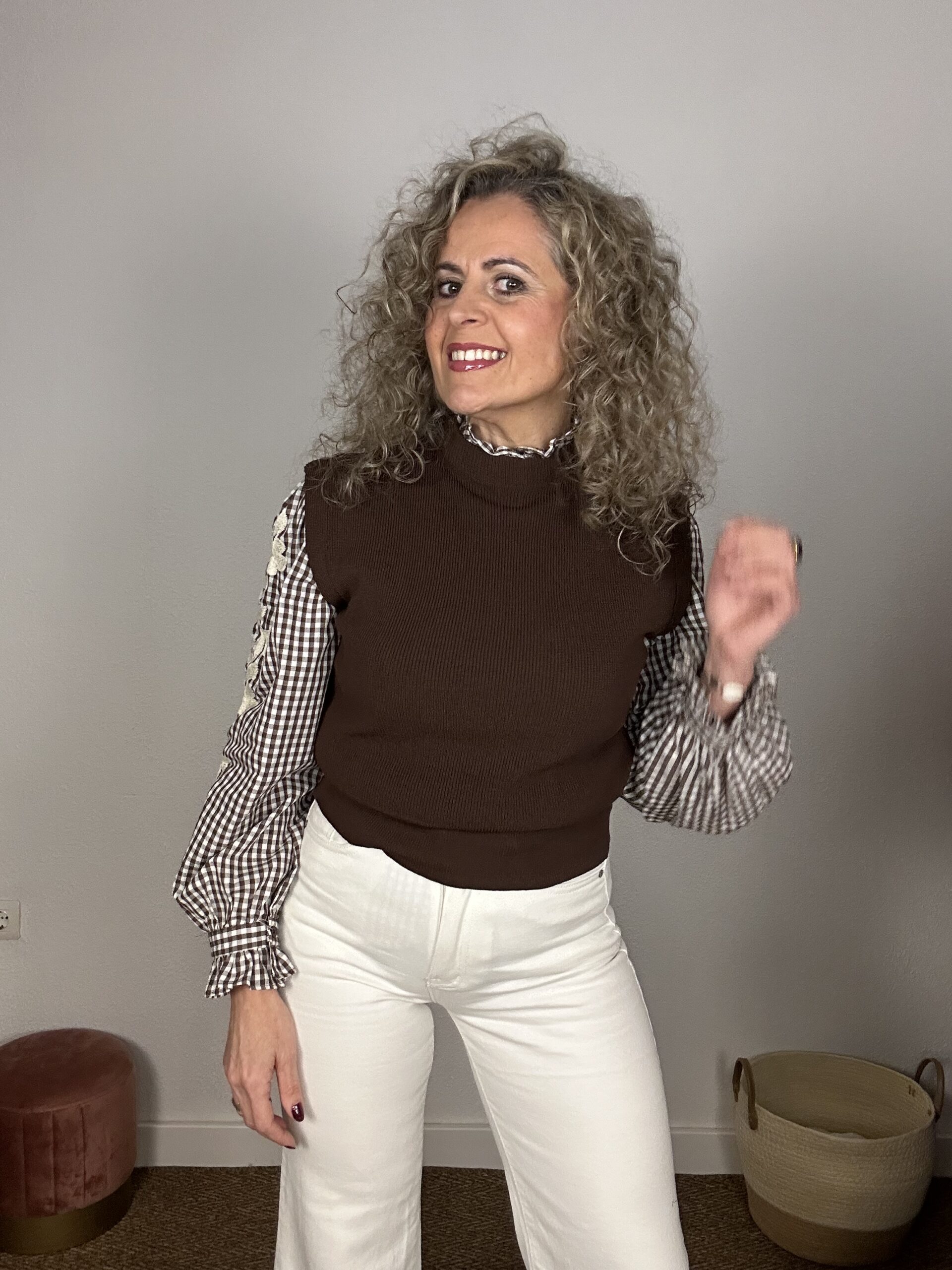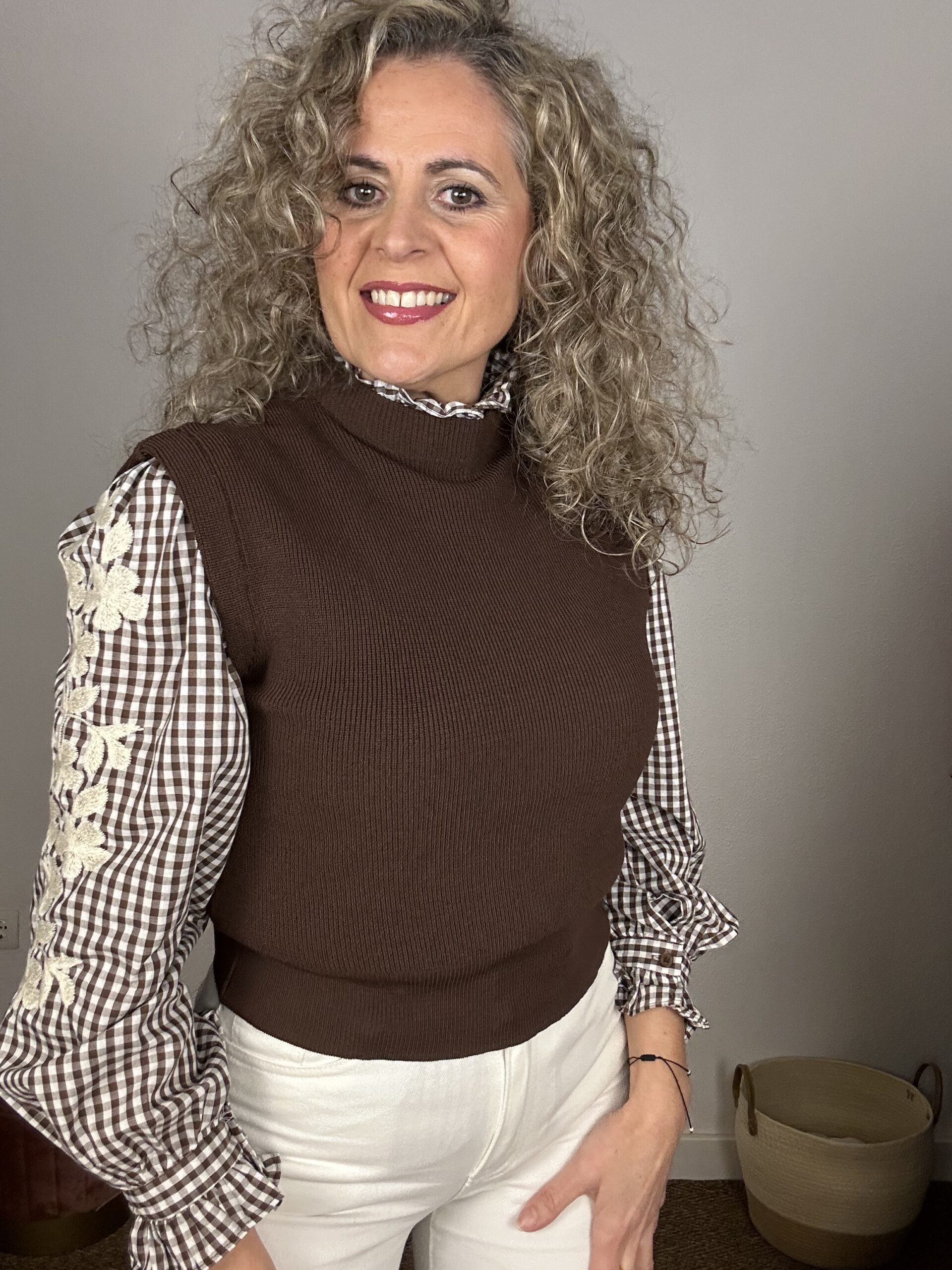 Chaleco de punto marrón sin mangas, con cuello ligeramente subido y acabado suave. Una prenda versátil y atemporal, perfecta para superponer sobre camisas y blusas y crear looks elegantes de entretiempo.