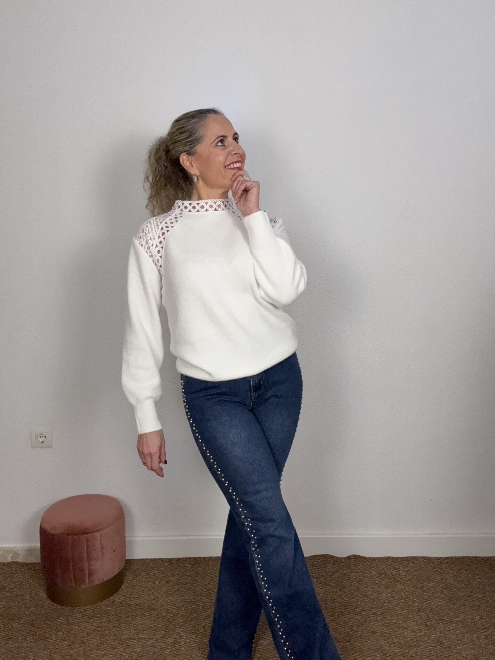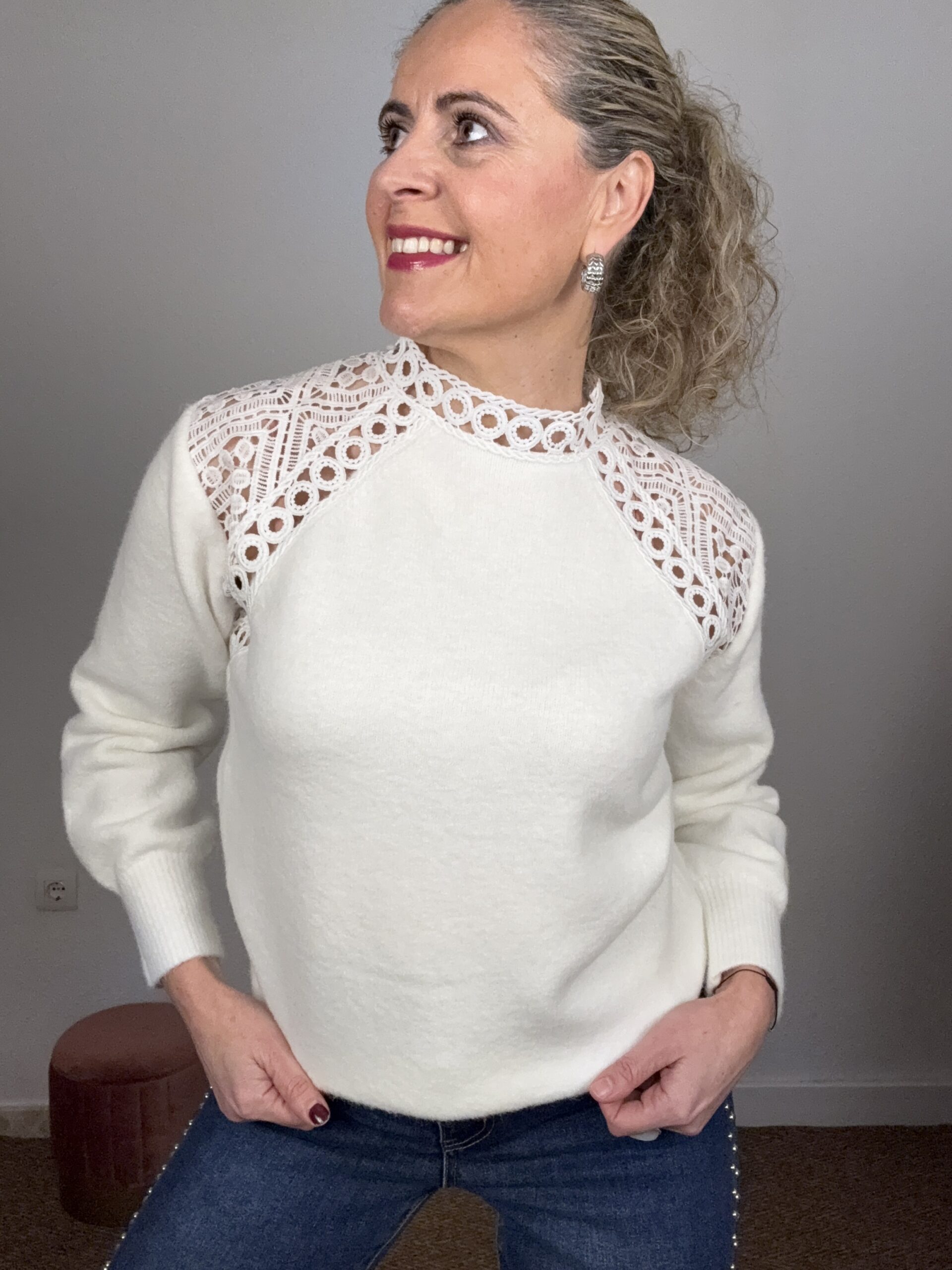 Jersey blanco con detalles calado en el hombro. Talla única, se adapta desde la 36 hasta la 42 aproximadamente.
