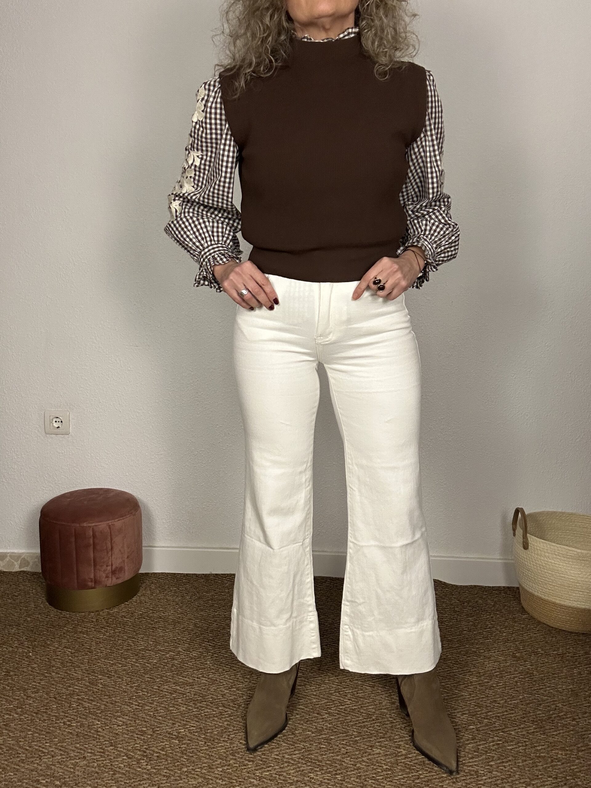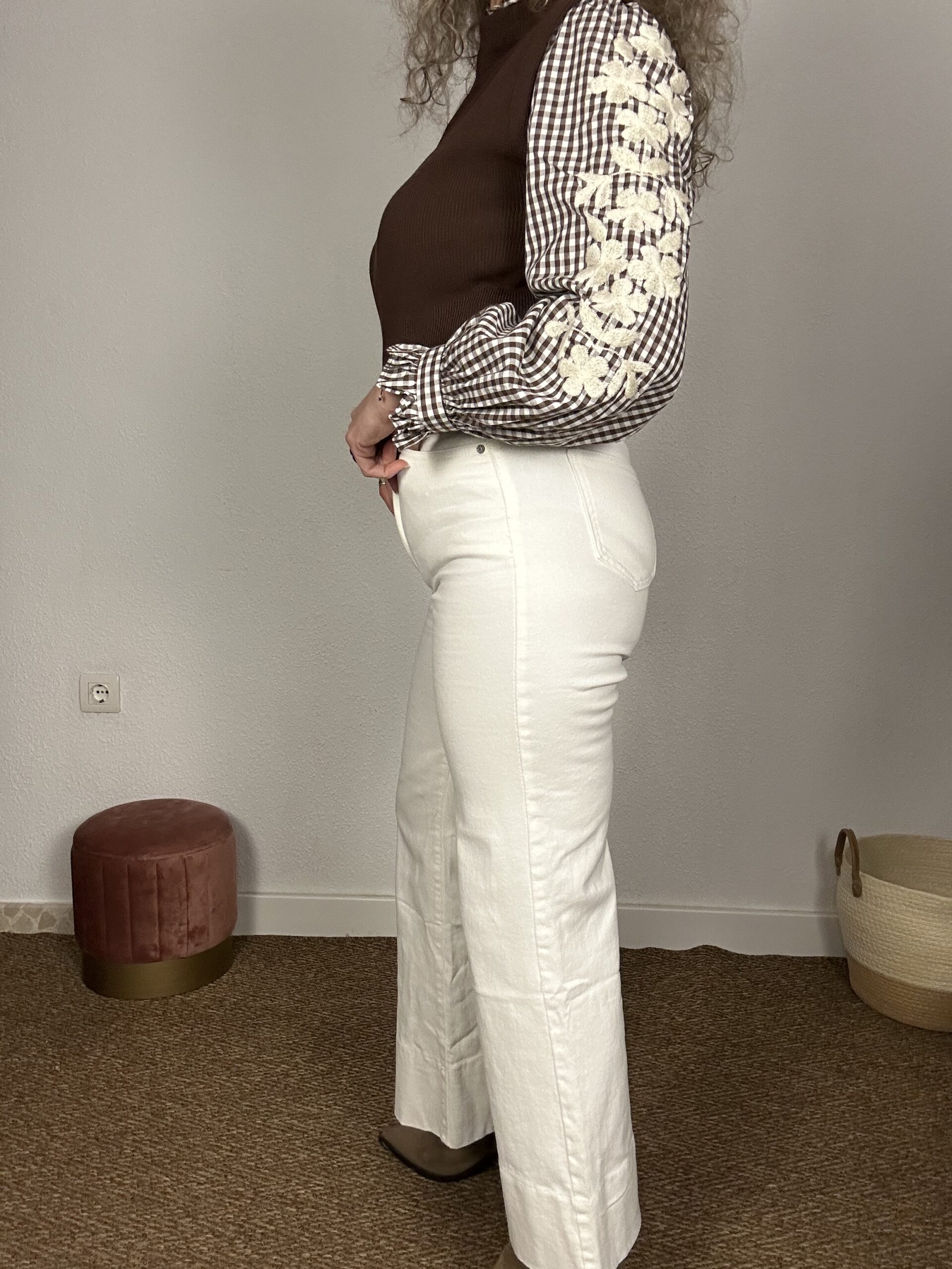 Jeans cropped flare de tiro alto blanco,con bajo acabado sin costuras. Diseño de cinco bolsillos. Cierre frontal con cremallera y botón metálico.