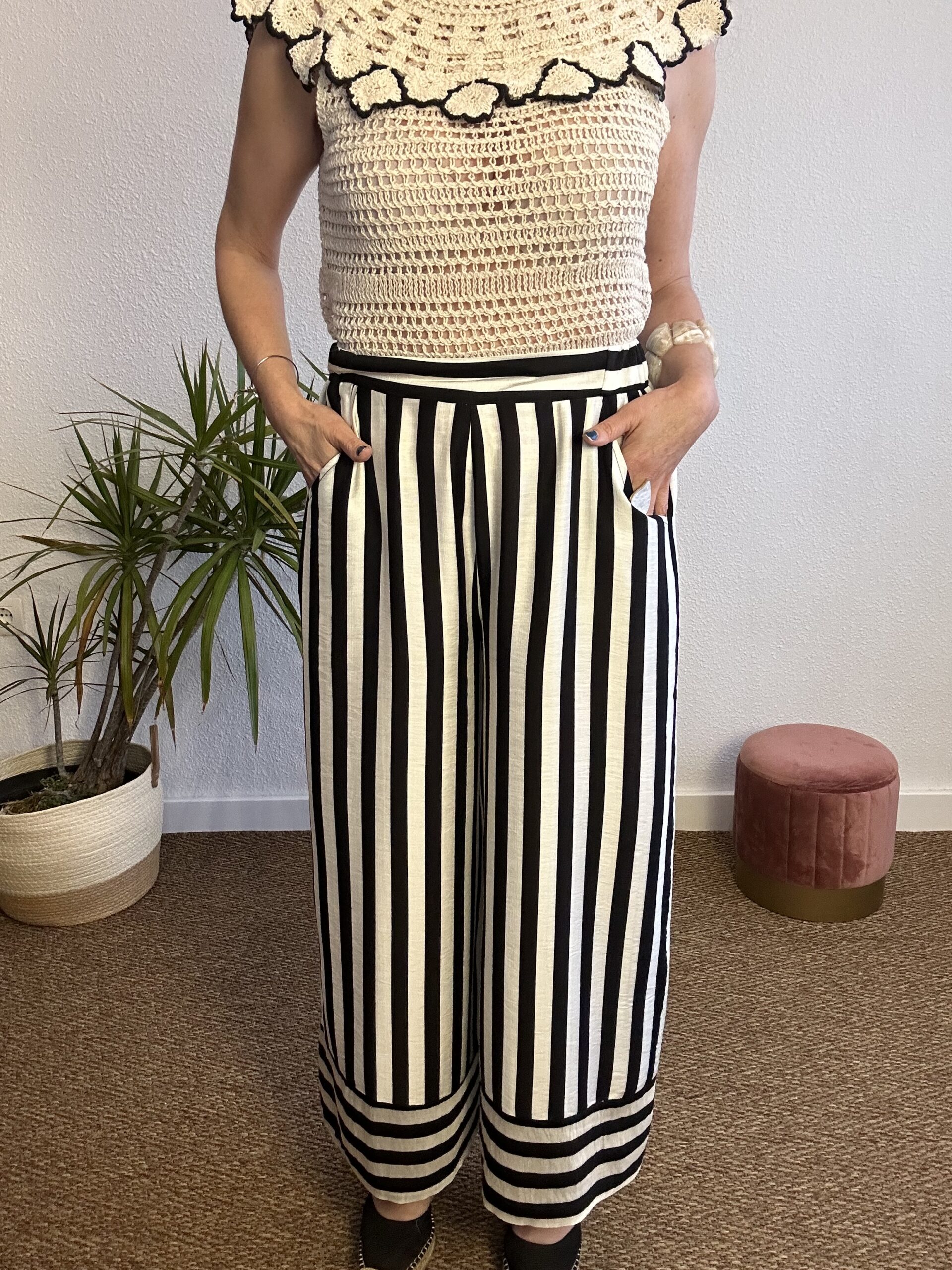 Este elegante pantalón palazzo combina comodidad y estilo con un diseño de rayas verticales en blanco y negro que alarga visualmente la figura. Confeccionado en una tela ligera y fluida, presenta bolsillos laterales funcionales y una cintura alta con elástica detrás cintura que define la silueta. El detalle de rayas horizontales en el dobladillo añade un toque moderno y sofisticado. Perfecto para un look casual chic o para destacar en eventos más formales con un top adecuado.