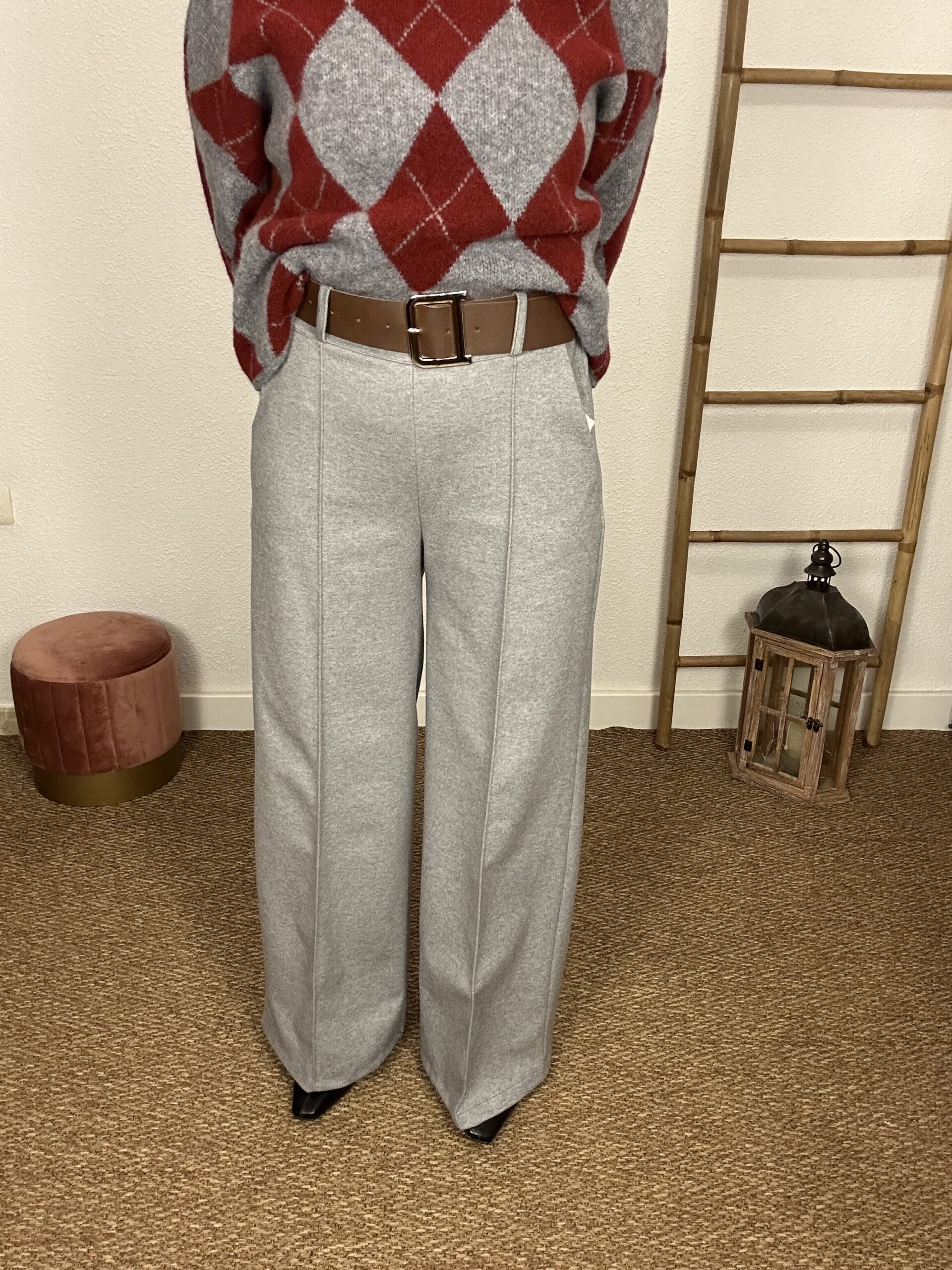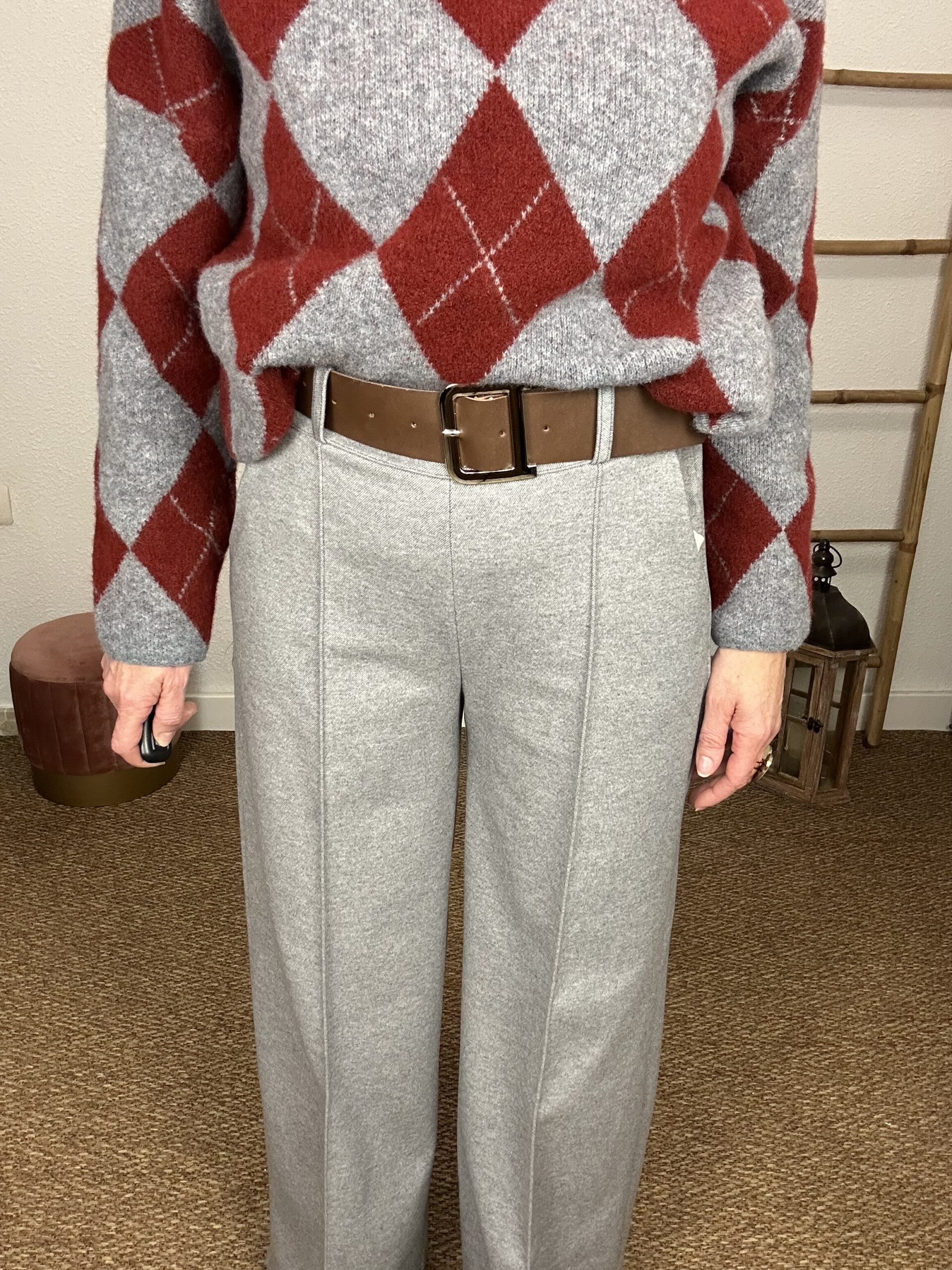 Pantalón de punto con pierna recta y costura frontal. Incluye cinturón, bolsillos laterales y cintura elástica en la parte trasera para un ajuste cómodo. Suave, versátil y fácil de combinar.