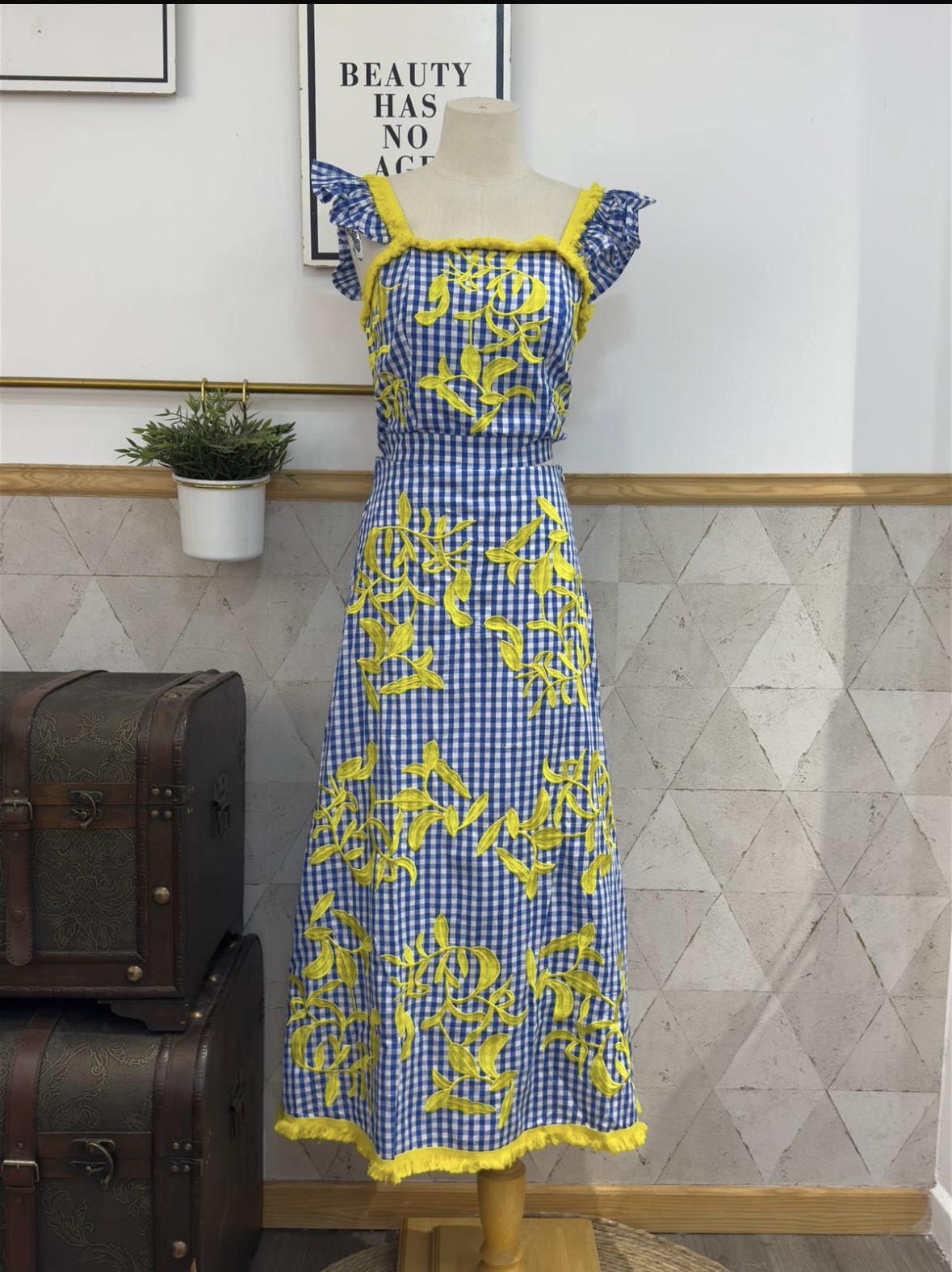 Conjunto de vichy con bordado en amarillo. Top sin mangas con bordado en amarillo y espalda nido de abeja.