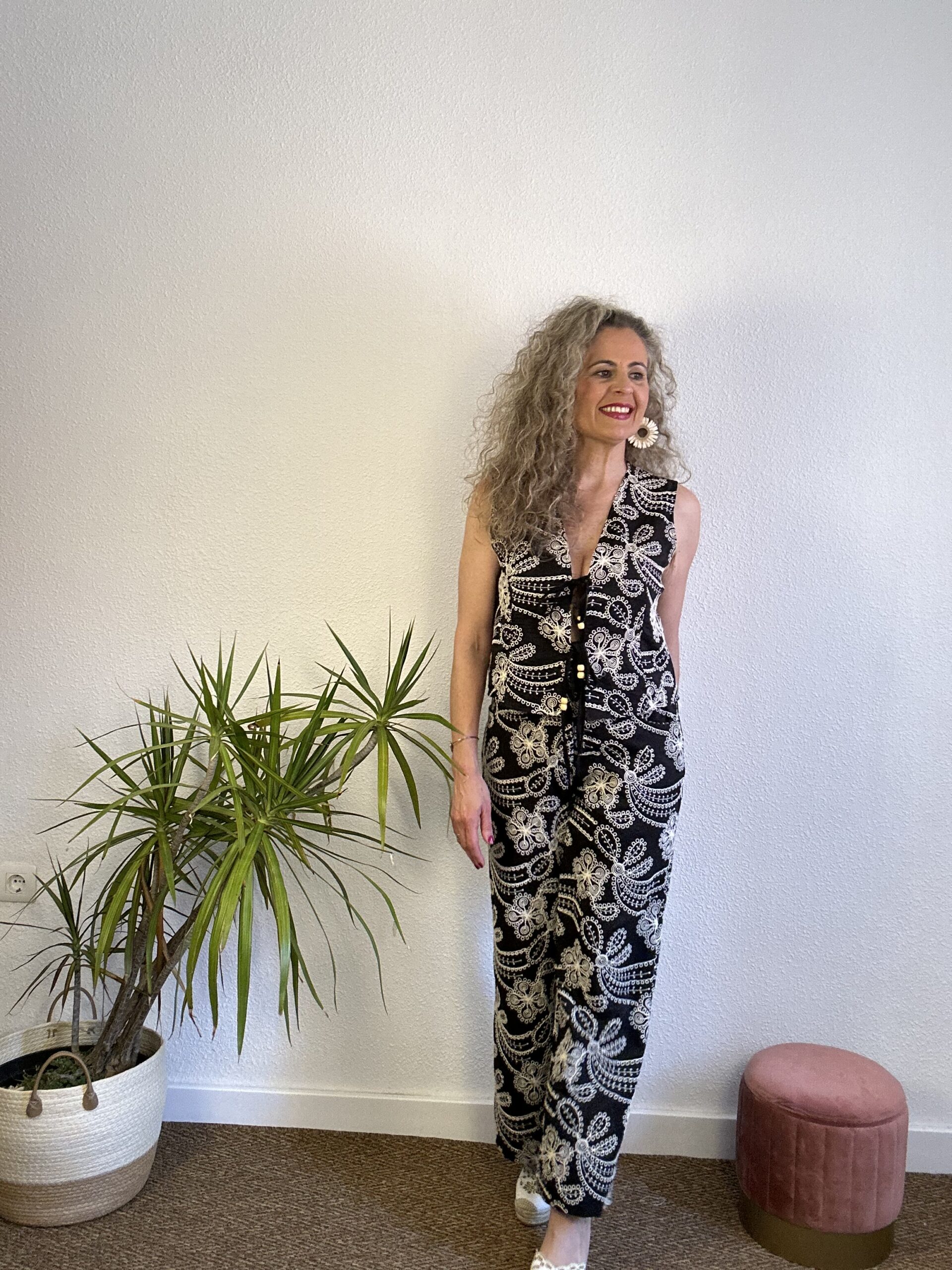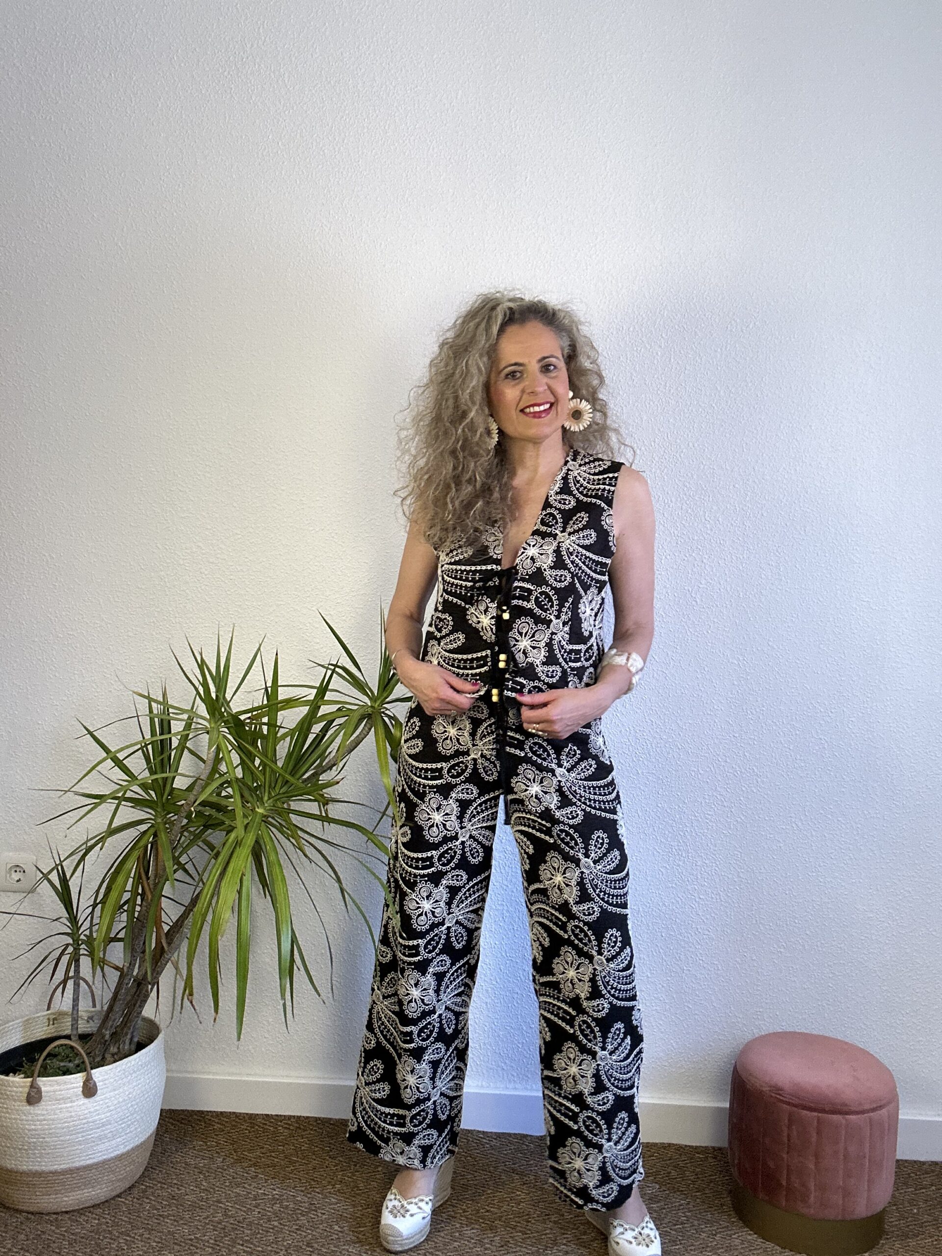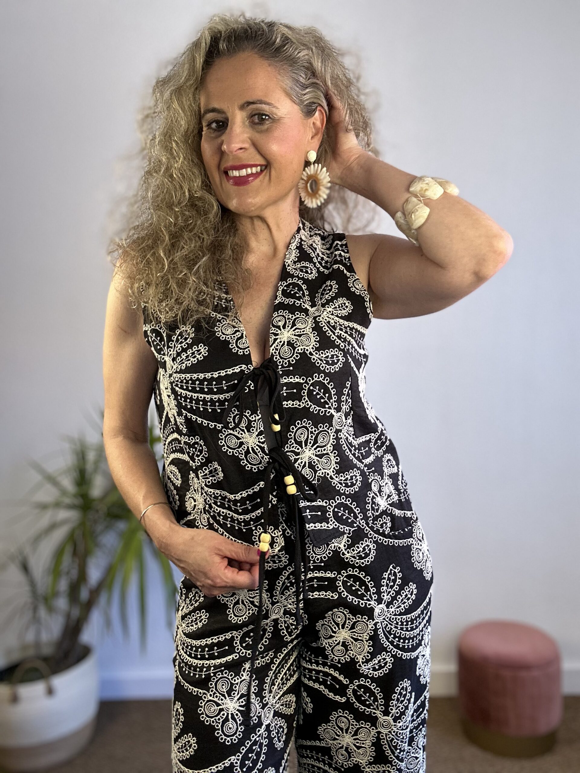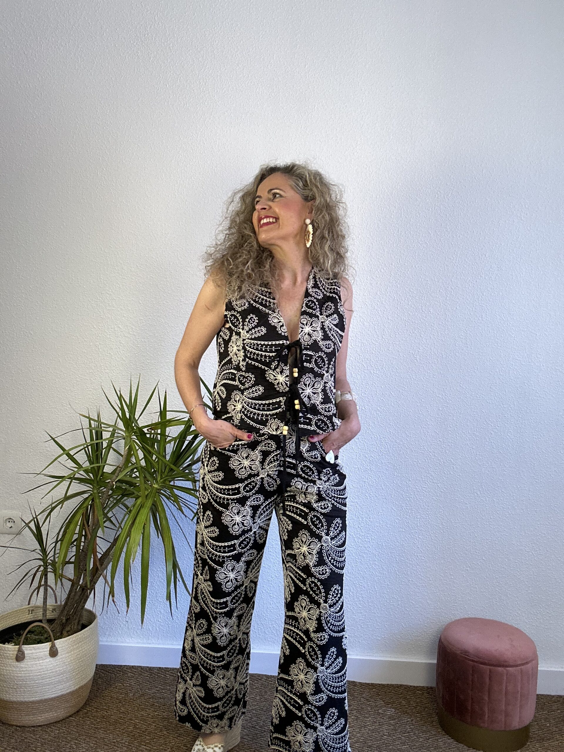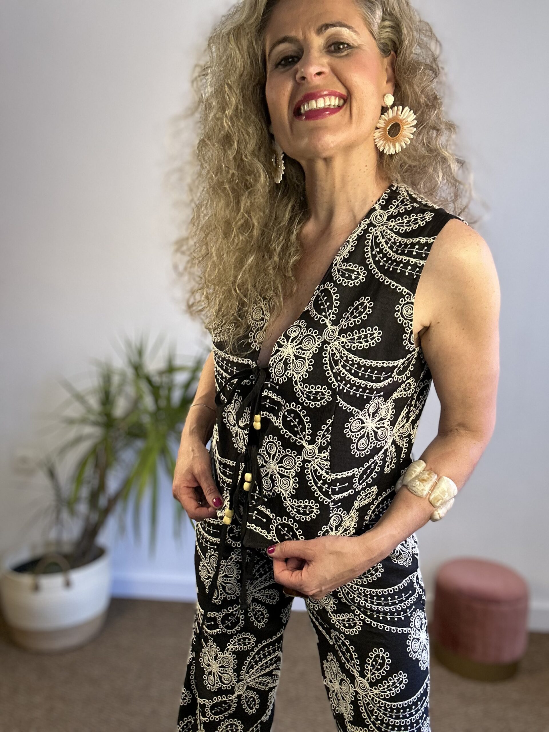Conjunto bordado negro formado por chaleco y pantalón. Chaleco sin mangas y cierre mediante cordón. Pantalón con bolsillos y gomita en la parte trasera. Cierre mediante botón y cremallera.