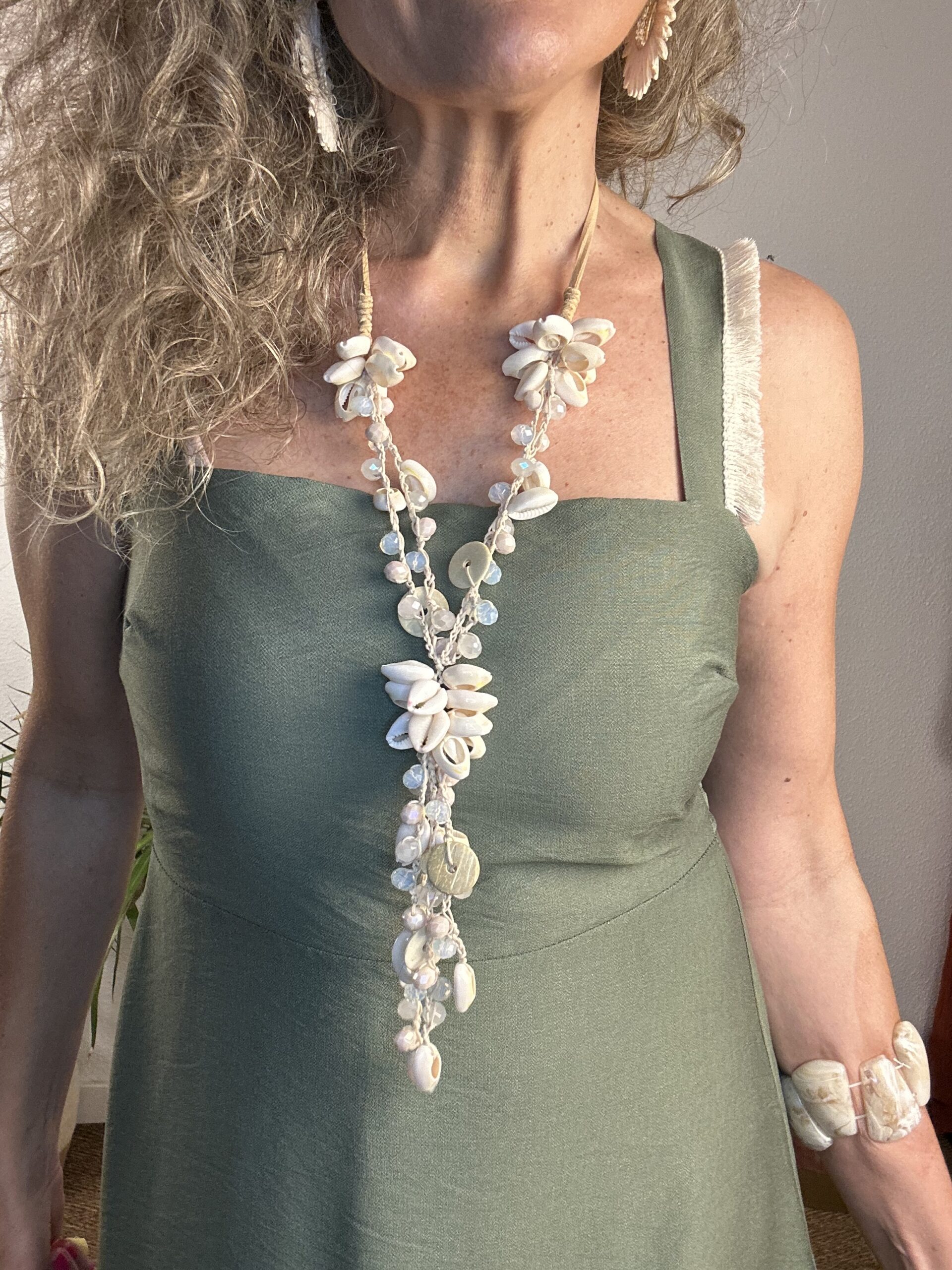 Vestido midi de tirantes en tono verde oliva con detalles de flecos en crudo.